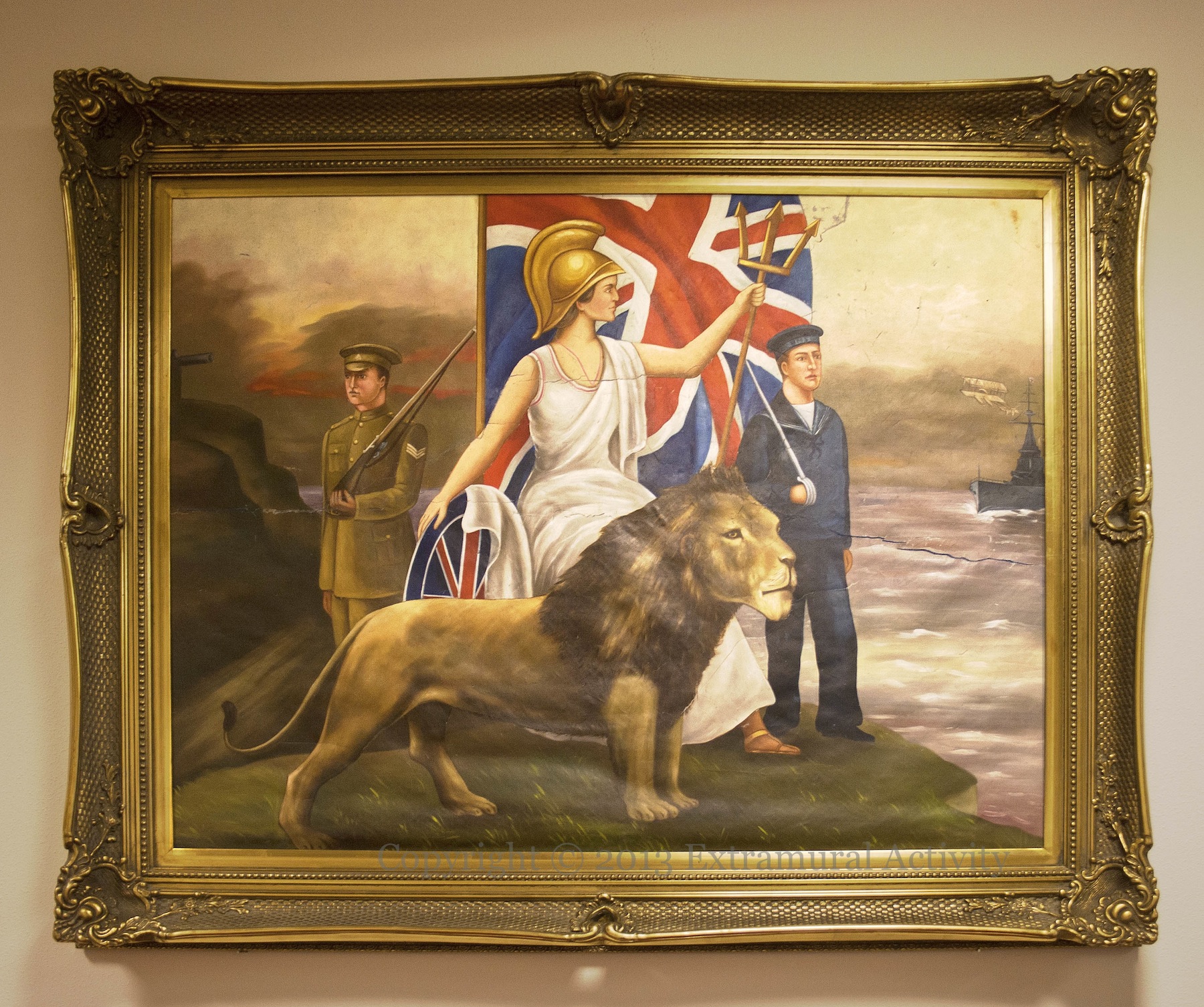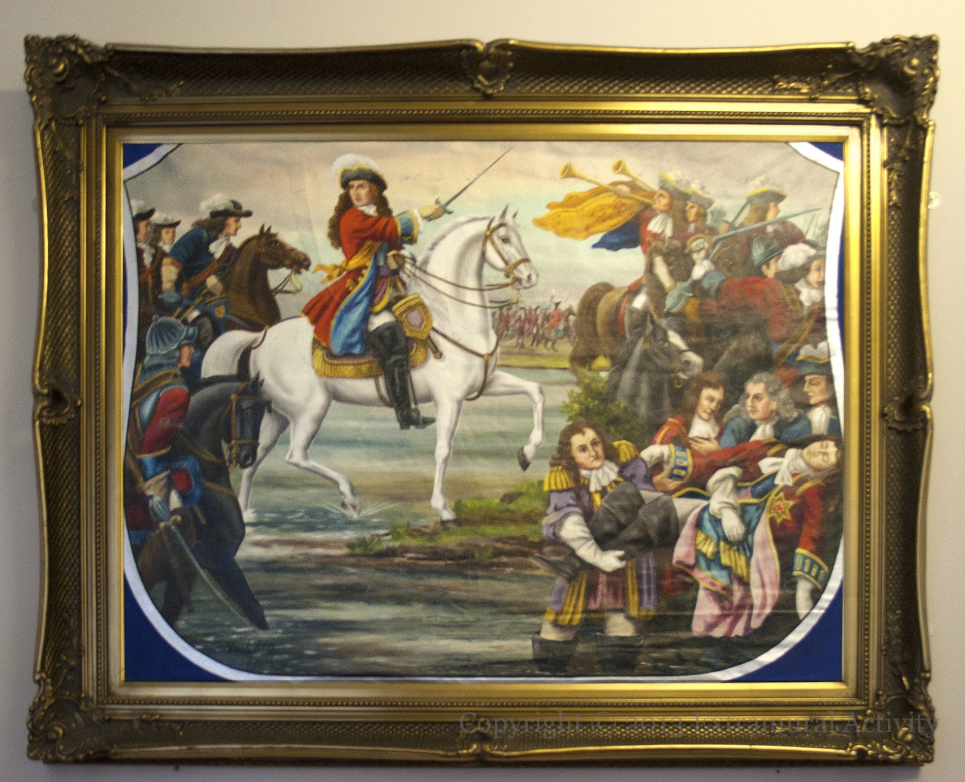 Two more images from inside the Clifton Street Orange Lodge, one of Britannia and a lion by the shore, between the army and the navy, and the other (below) of the victory of William of Orange over James in 1690.