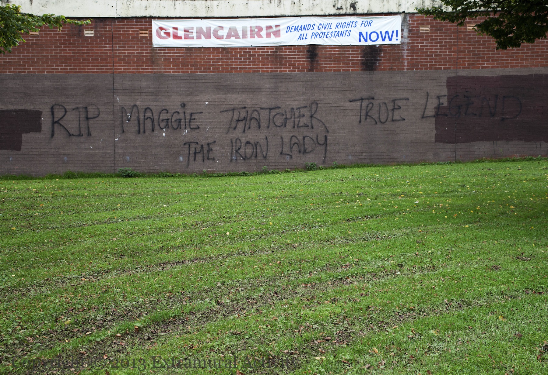 Graffiti on the Forthriver Road, in Glencairn: “RIP Maggie Thatcher. True Legend. The Iron Lady.” Beneath a banner reading “Glencairn demands civil rights for all Protestants now!”