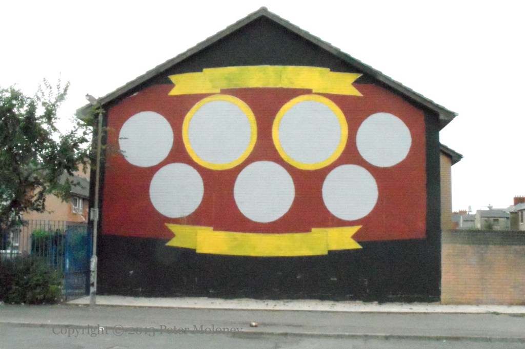 Update: 2013-12-24 Two plaques have been added to the piece above, one showing the photographs upon which the portraits in the mural were based (except Keenan’s), and the other describing the process by which the Ulster-Scots mural was replaced as part of a project by Charter NI (along with the city council and the housing executive). It reads: “Communities Moving Forward Re-Imaging Programme Phase One. The concept of renewal, change and respect lies at the heart of the ‘Communities moving forward’ programme, which recognises the importance of creativity in all its manifestations and in all our lives, reflecting the heritage of our communities in a positive manner. Boxing through the generations showcases the positive images of this proud small community.” (Also: NIHE press release)