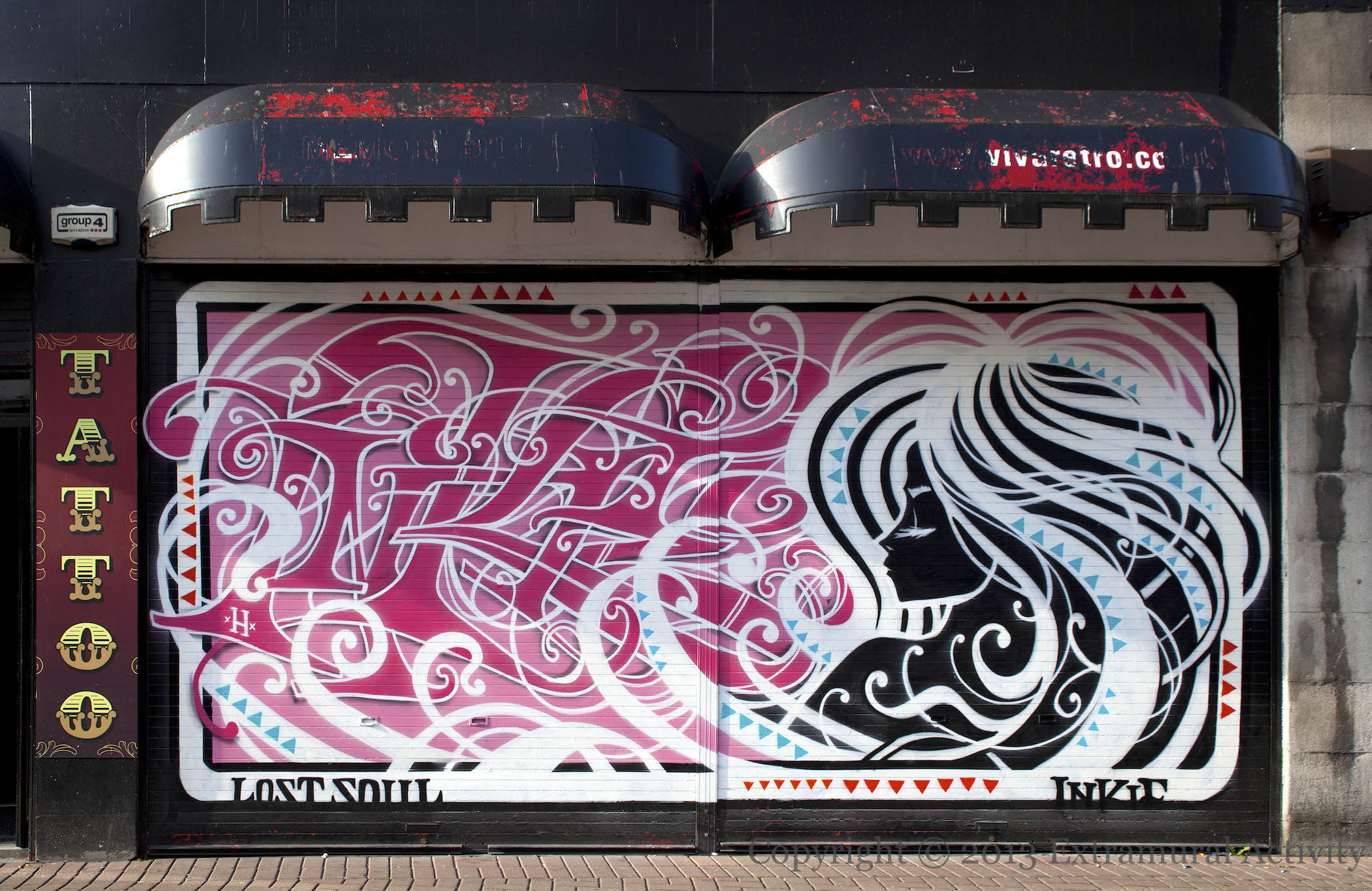 Here is another piece of Culture Night Belfast 2013 artwork, produced by Inkie on the shutters – suitably enough – of a tattoo parlour in North Street.