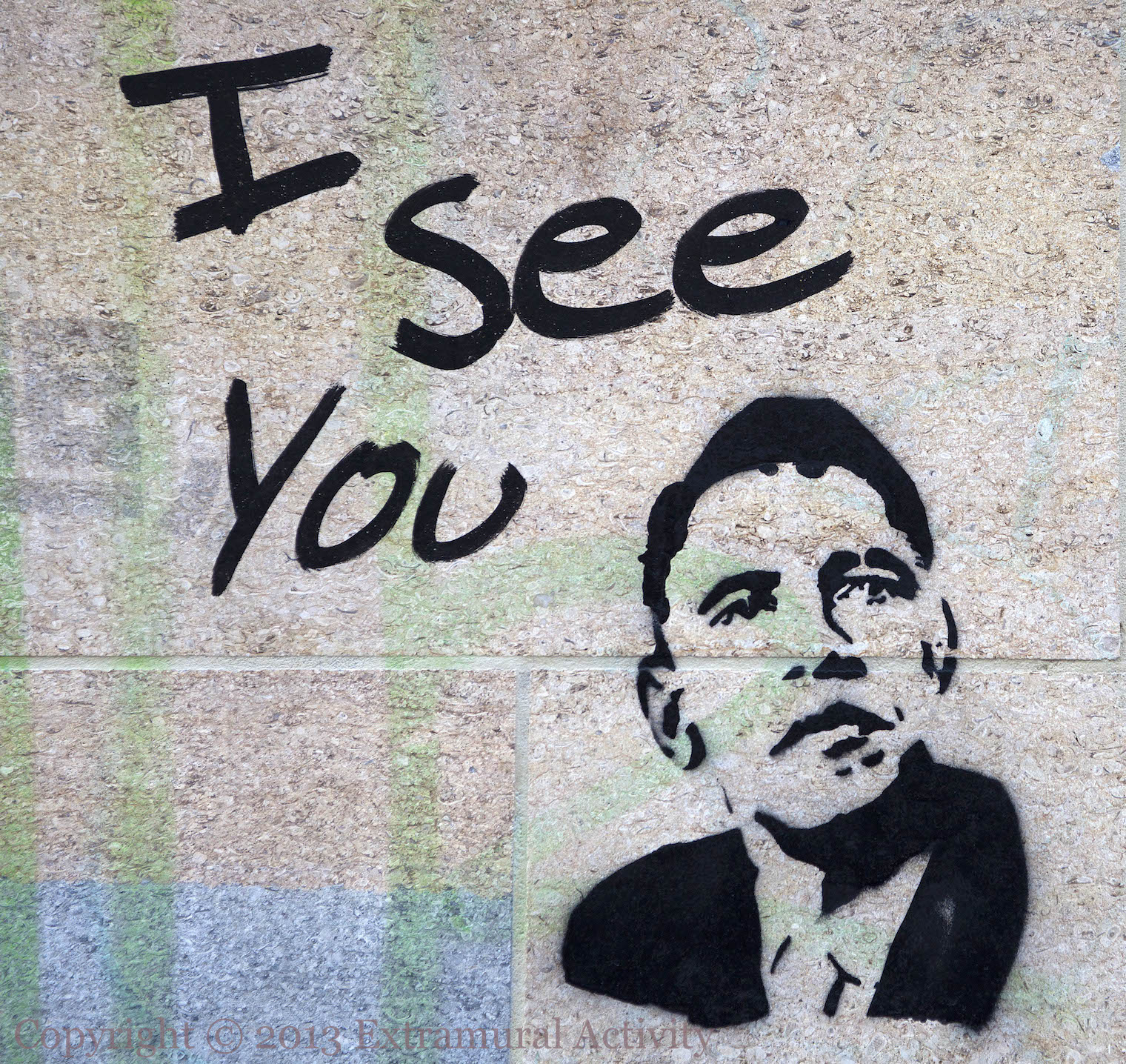 Here are two more stencils about the Obama regime’s espionage programme, complementing the ‘Don’t Drone Me, Bro’ piece. Both are in Fountain Street. The first says “I see you” and the second “I promise I won’t look”.