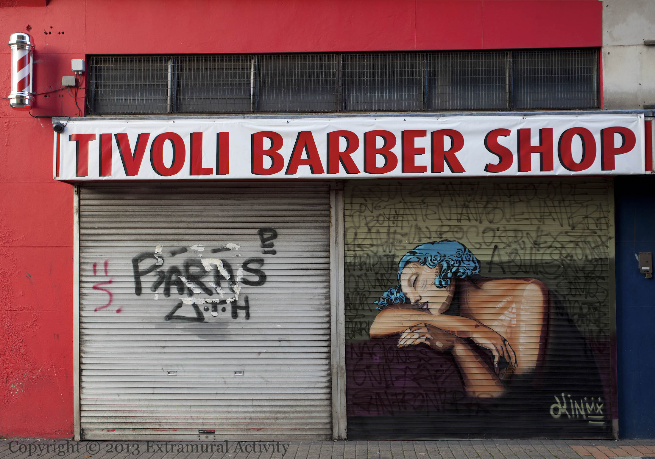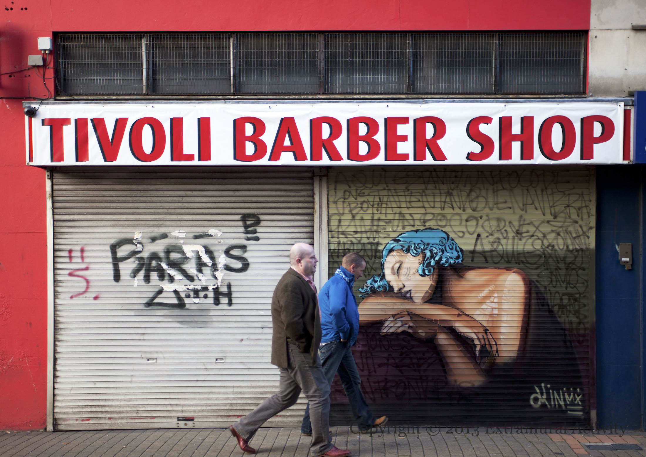 A blue-locked beauty sleeps on the shutter of the Tivoli Barber Shop in North Street, painted by KinMX (Fb) for Culture Night Belfast, 2013. (Other CNB pieces.)