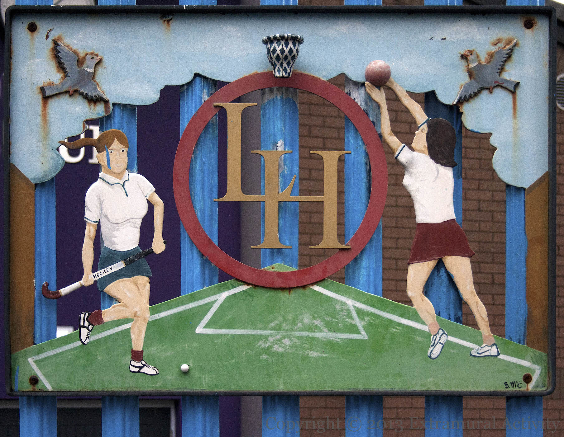 Here are four small painted metal-work pieces, signed “B McC”, on the railings of the Ledley Hall Boys & Girls Club, just off Beersbridge Road in east Belfast. The pieces show the building, soccer being played in the shadow of Harland & Wolff – the goal is prevented by a giant red hand – and two boxers boxing – the club was originally a boxing gym (est. 1942), and girls playing hockey and netball.