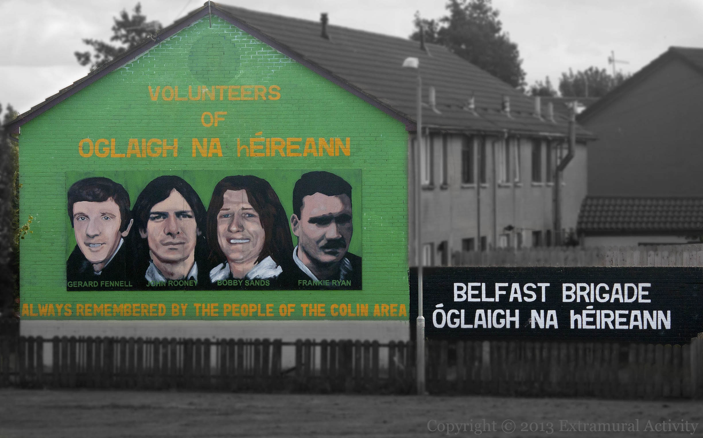 This mural commemorates Gerard Fennell, John Rooney, Bobby Sands, and Frankie Ryan, IRA volunteers from the Twinbrook and Poleglass areas who died between 1974 and 1991 (Ryan). The mural is visible to drivers on the Stewartstown Road. Painted by Rısteard Ó Murchú.
