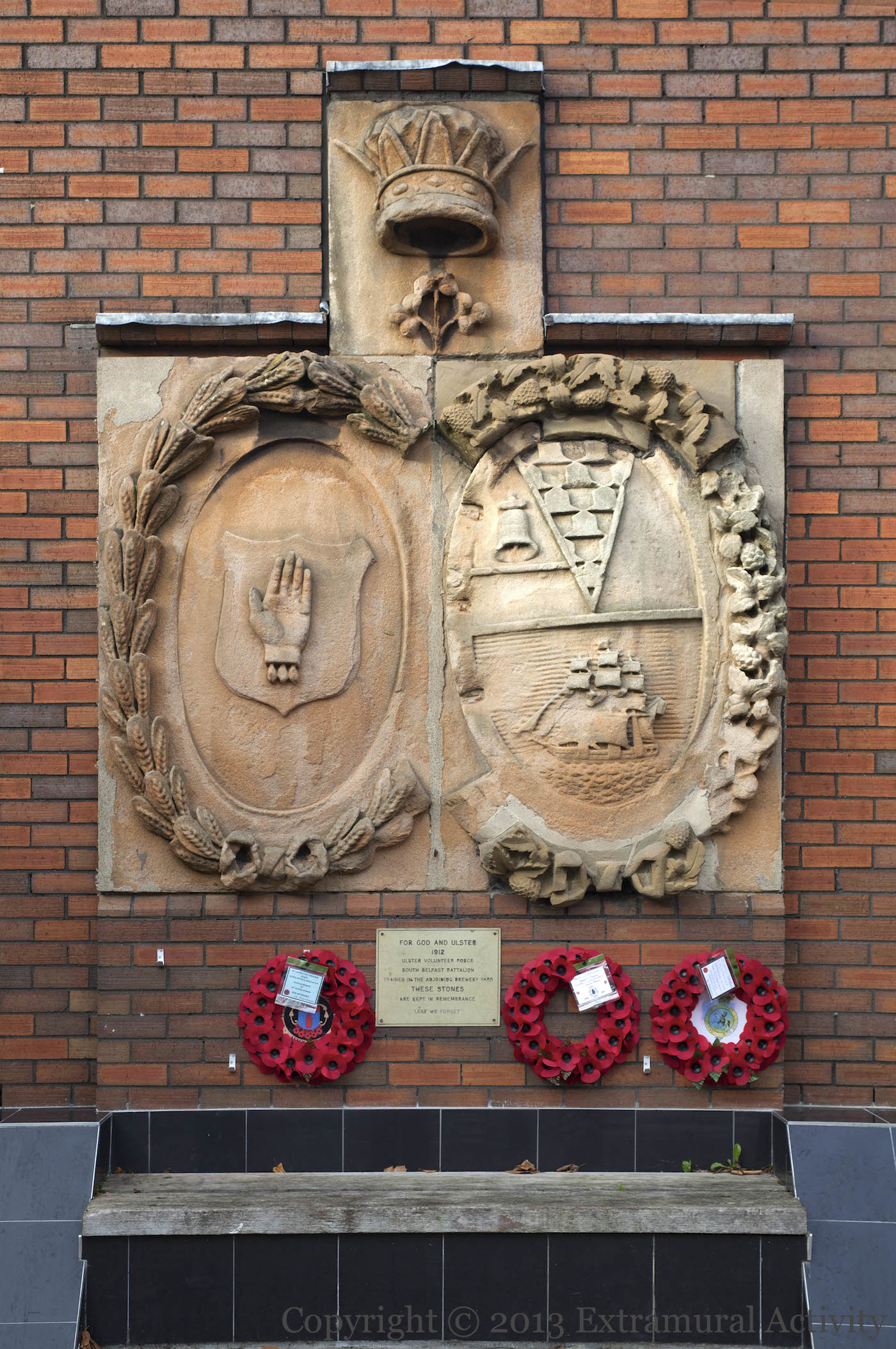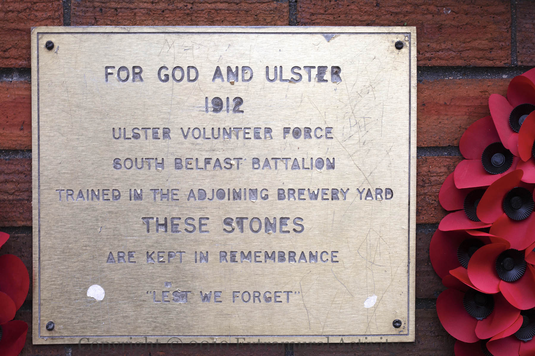 Sandy Row Ulster Volunteers/WWI memorial: “For God and Ulster 1912, Ulster Volunteer Force, South Belfast Battalion, trained in the adjoining brewery yard. These stones are kept in remembrance, “lest we forget”.”