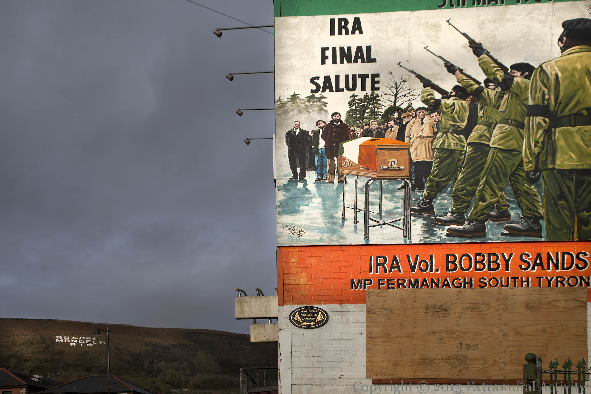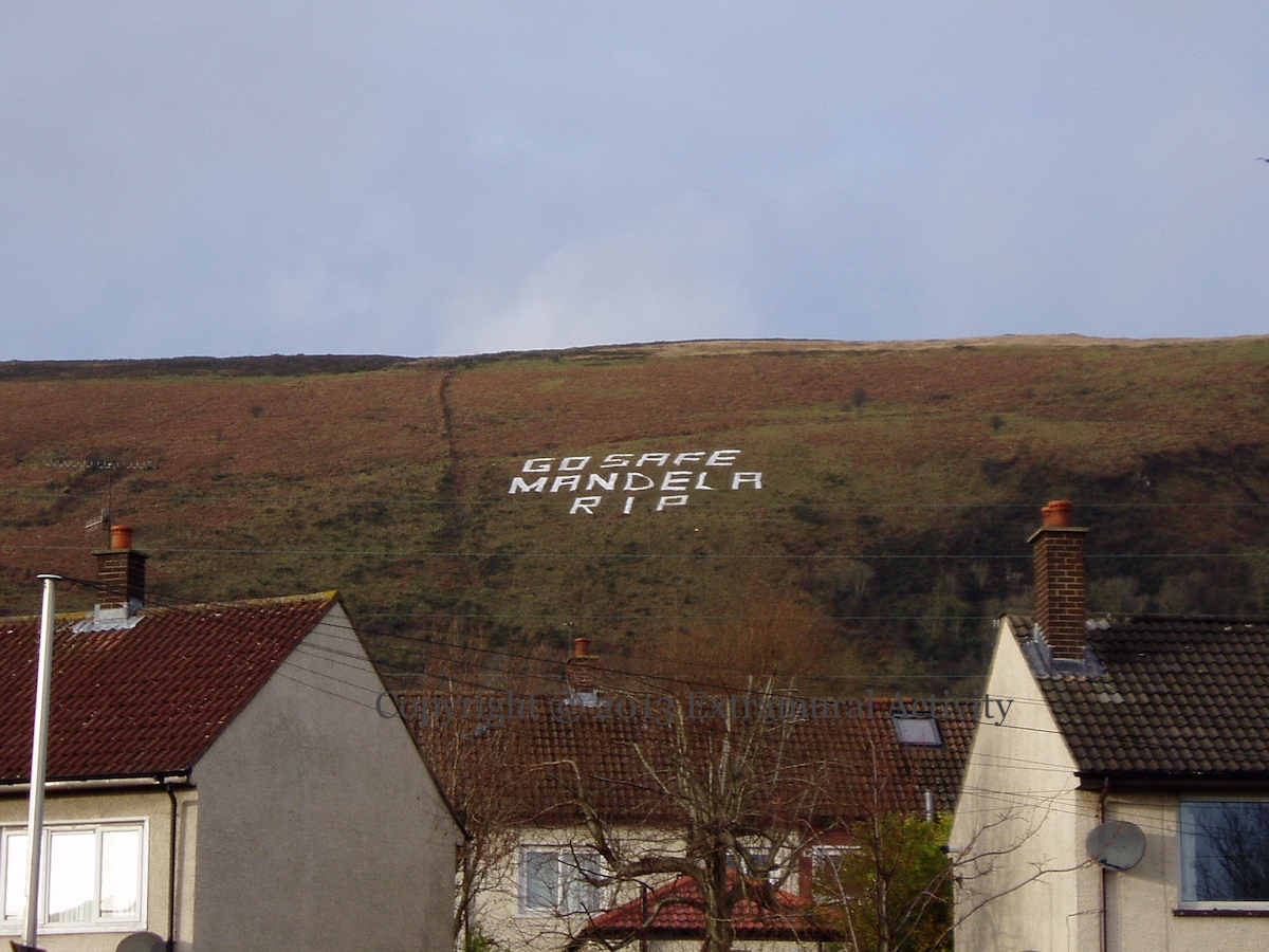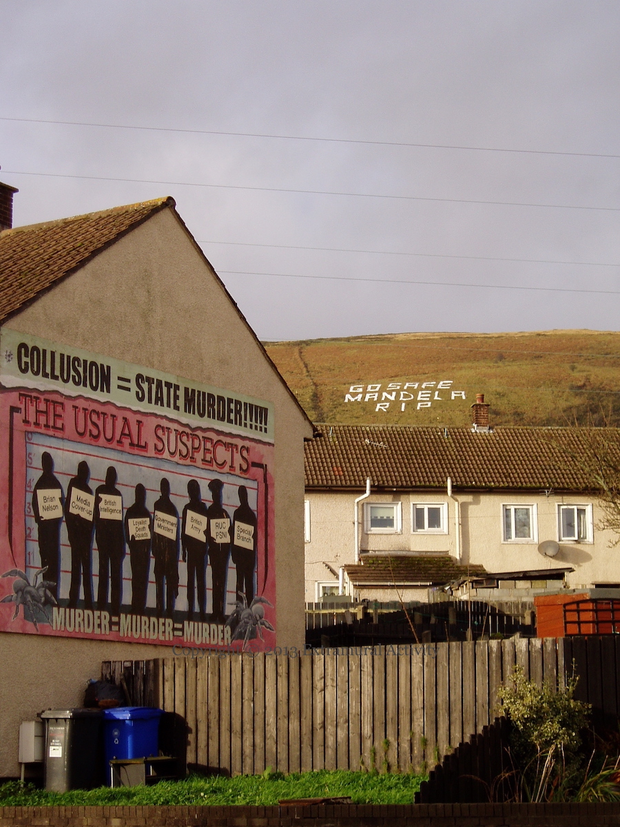 Four shots of the “Go safe Mandela – RIP” lettering by Gael Force Art on Slıabh Dubh/Black Mountain two weeks ago, commemorating the death of Nelson Mandela on December 5th, 2013. The one above is on the Springfield Road with ‘The Usual Suspects’ in the foreground. (Previously from the same location: G8 War Criminals.) The second, below, is from the Whiterock Road and involves the ‘IRA Final Salute’ mural.