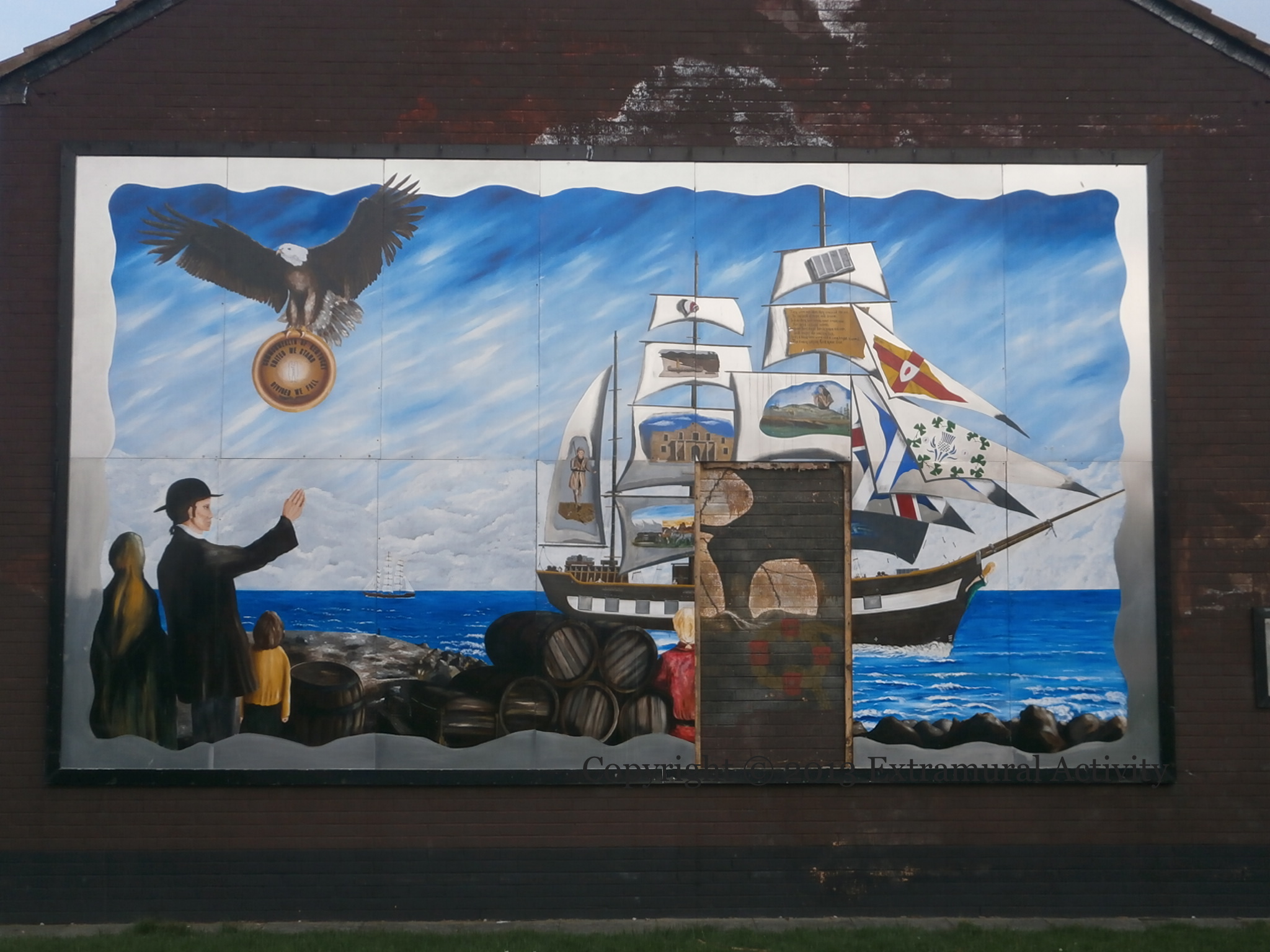 Three panels in Newtownards about the Scotch-Irish (or: Ulster Scots) emigration to the United States in the middle of the eighteenth century. Each of the three shows a stage of the experience: ‘Farewell Brothers’ shows family left behind looking out over the sea at the receding ships; ‘The Voyage’ shows sleeping conditions on-board; ‘The Arrival 1731’ shows the flags of the United States and Northern Ireland, with the statue of liberty superimposed upon a red hand.