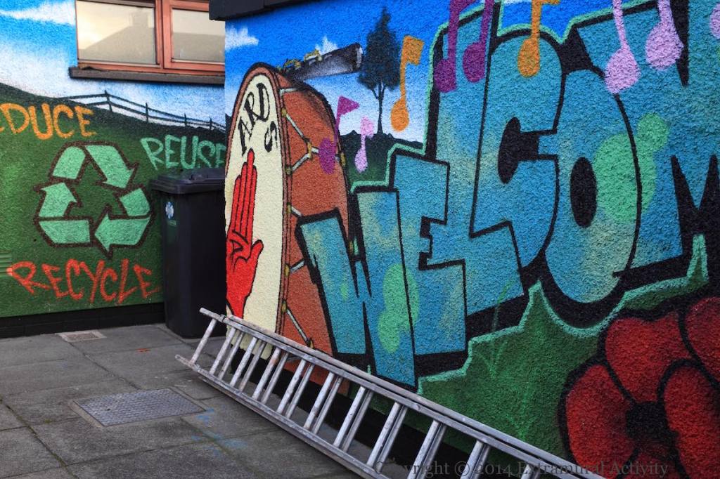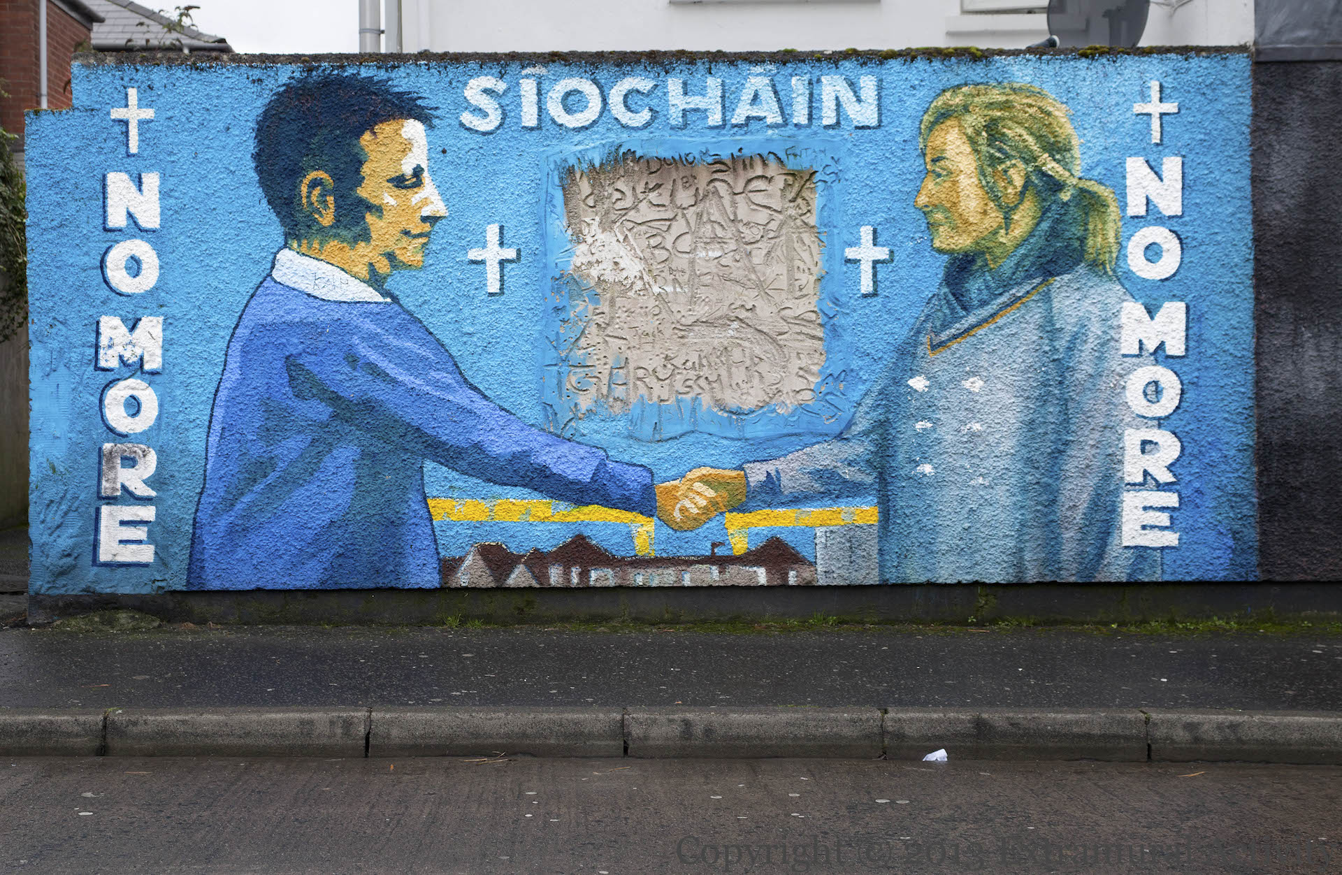 A gable-wall version of this image — without the word “síocháın” (peace), with the girl in green, and with Wilson’s poem ‘No More’ — can be found about half a mile away in Wolfe Close, just across the Newtownards Road. See No More, Again. This mural was part of the re-imaging effort of 2010.