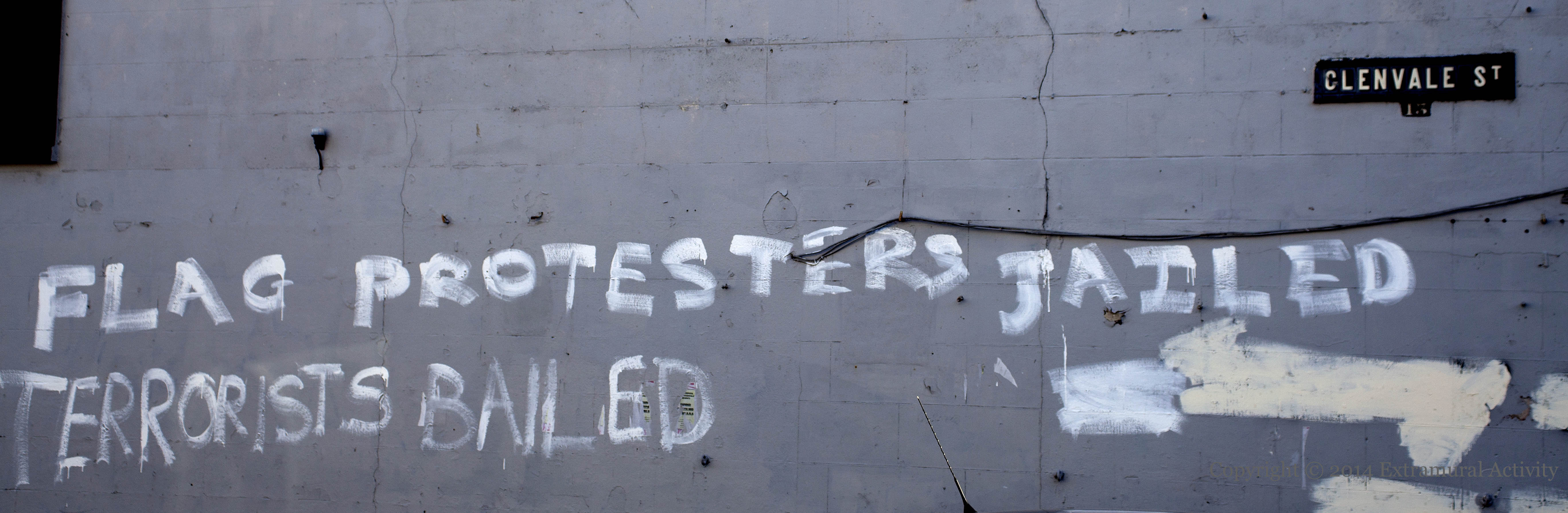 The first – “Flag protesters jailed, terrorists bailed” – is in Glenvale Street, just off the Woodvale Road.