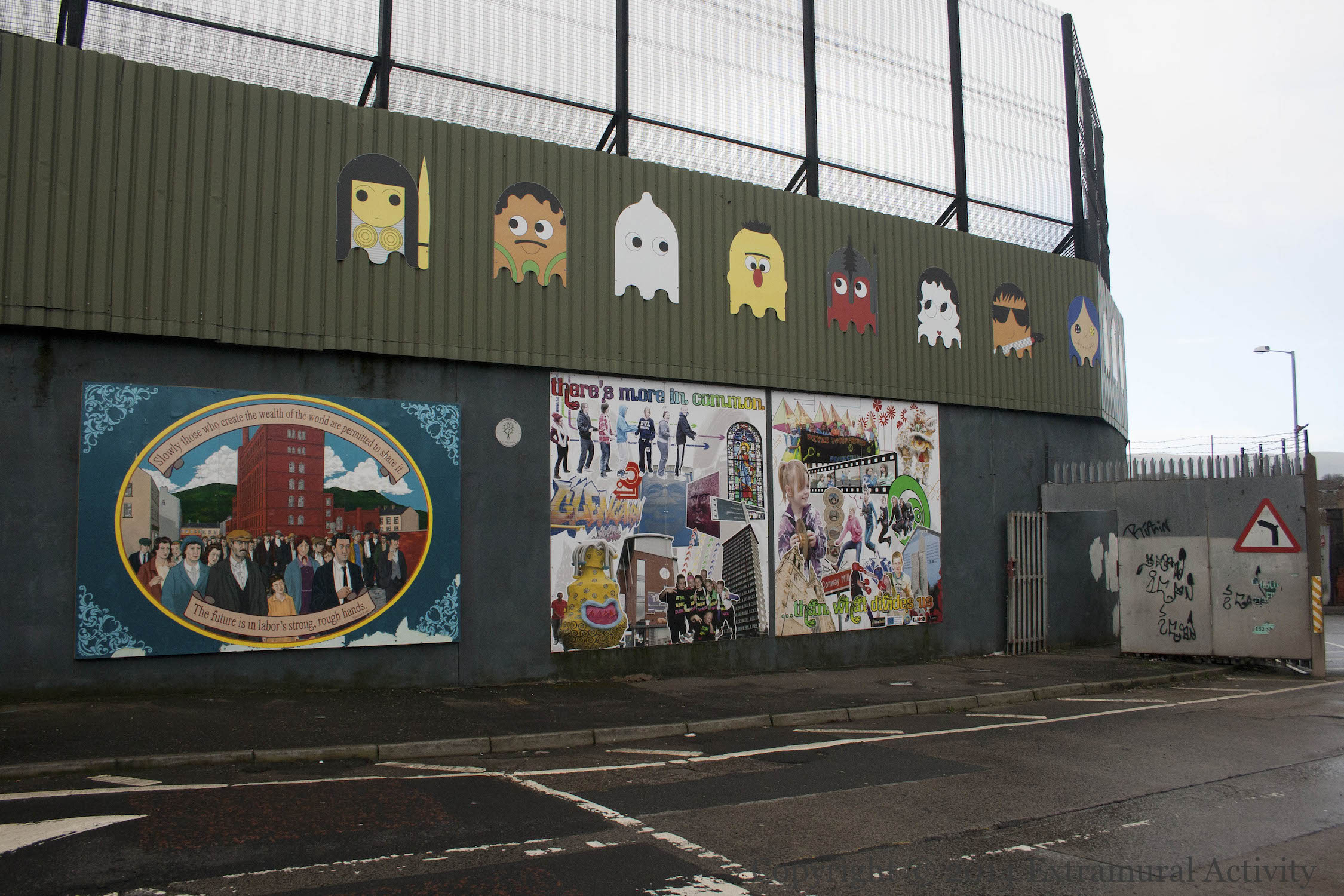 This board on the Cupar Way “peace” line at the North Howard Street gates features a quote by Mary Harris “Mother” Jones, “the most dangerous woman in America” for her labour organizing: Slowly those who create the wealth of the world are permitted to share it – The future is in labor’s strong, rough hands.” Wide shot below.