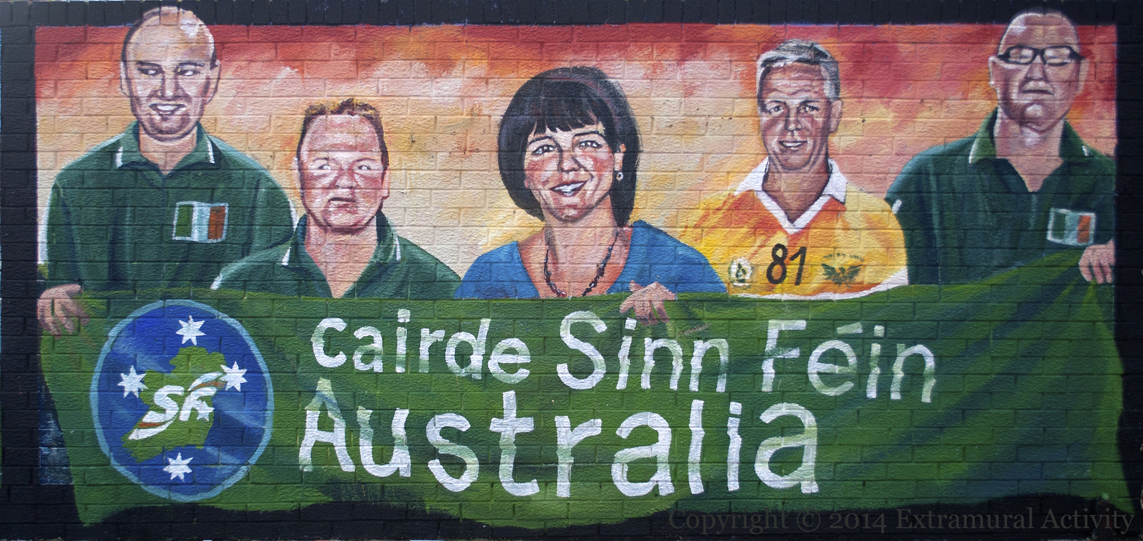 Above is the second of three 2013 murals sponsored by Australian groups outside the Republican Museum in Conway Street. This one shows members of the main sponsoring group, Caırde Sınn Féın (Fb).