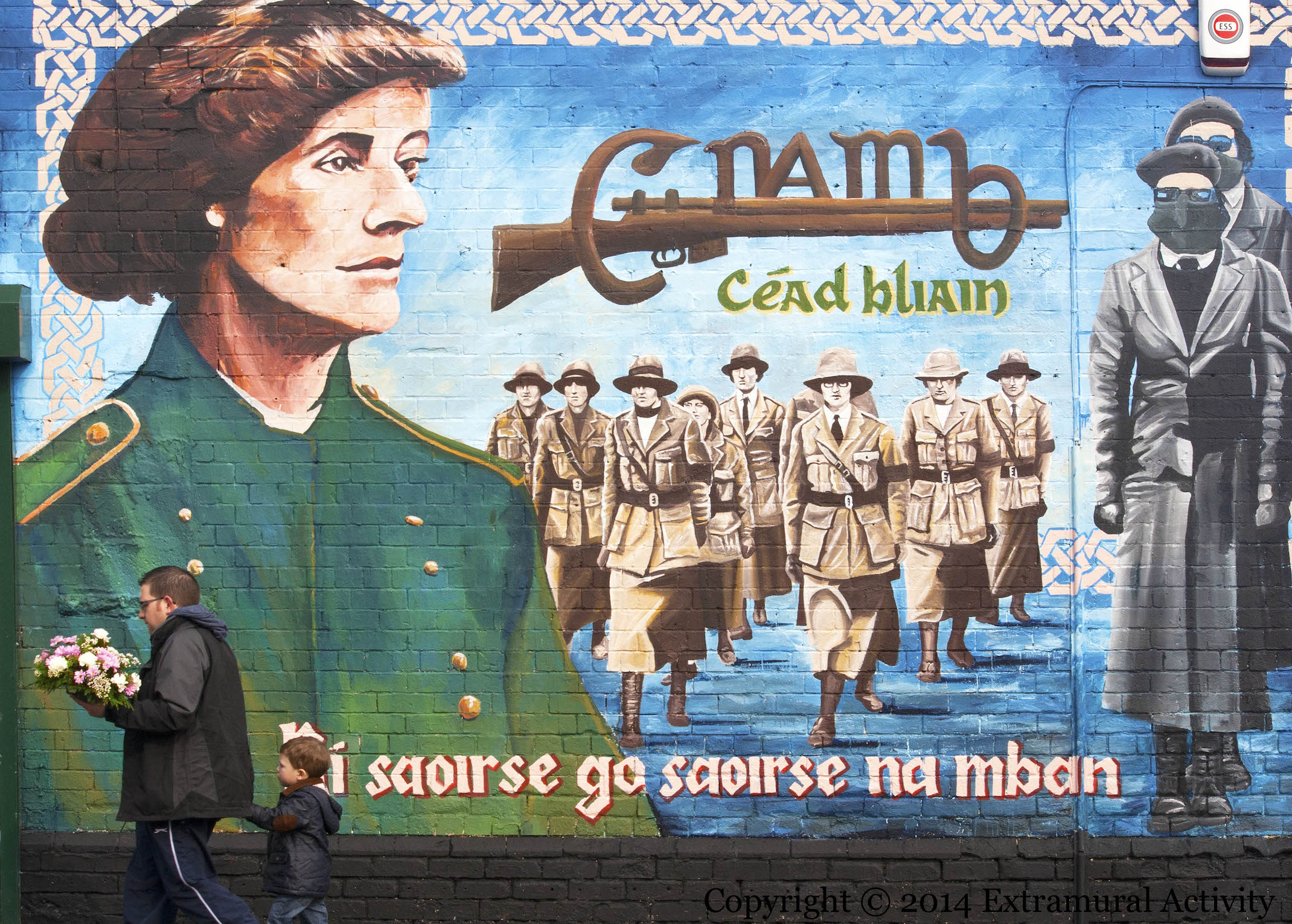 Cumann Na mBan was the women’s division of the Irish Volunteers and is best remembered for its role in the Easter Rising of 1916. Its members were involved in the occupation of many locations. Some, including (non-combatant) Winifred Carney, were in the GPO, while Countess Markievicz, the main figure of the mural, was in St. Stephen’s Green. (Here is an RTÉ gallery of vintage photographs, including one of Markievicz surrendering.)