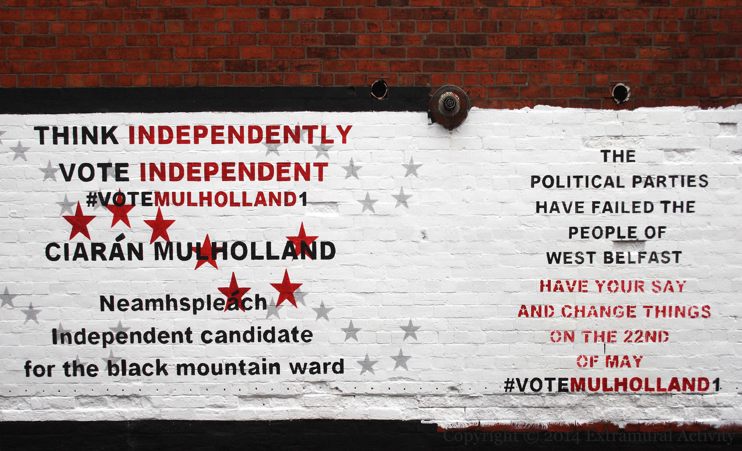 Electioneering is under way in Northern Ireland, ahead of the local and European parliament elections on May 22nd. Above is a stencil in Hugo Street drumming up support for independent (socialist) Ciarán Mulholland. “Think independently, vote independent. Neamhspleách/Independent candidate for the black mountain ward. The political parties have failed the people of west Belfast. Have your say and change things.”