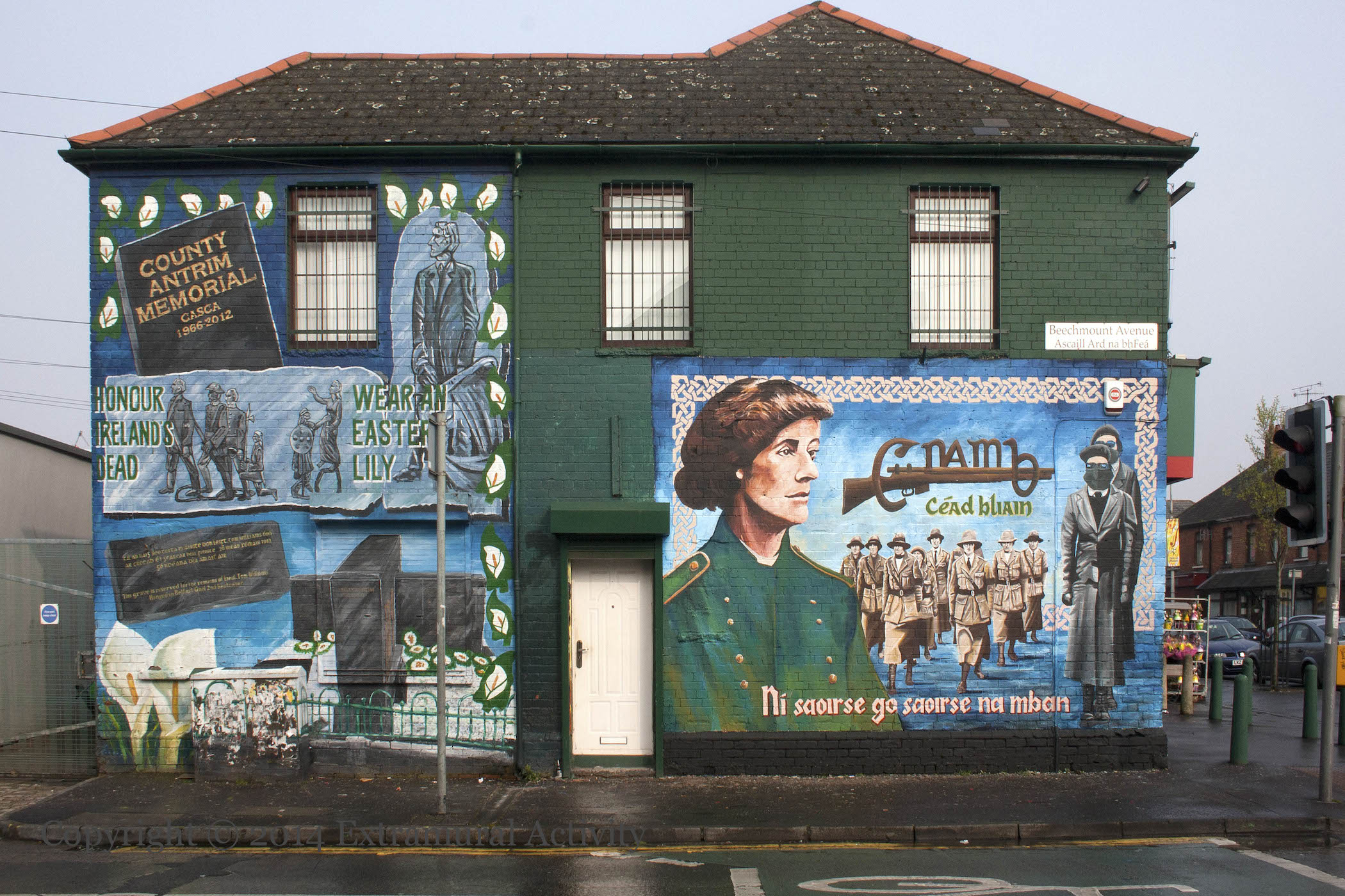April 24th, 1916 is the date of the commencement of the Easter Rising. The left-hand side of the building on the eastern corner of the Falls Road and Ascaıll Ard Na bhFeá (Beechmount Avenue) is a memorial to Republicans from County Antrim from 1798 to 1966 – when the ‘County Antrim Memorial’ was raised in Milltown on the 50th anniversary of the Easter Rising – and beyond; it is pictured in the lower right, a large cross-shaped monument. Tom Williams (WP), an IRA volunteer who was executed during the Northern Campaign (during the second world war) and is buried in the plot, is mentioned specifically on the headstone in the lower left.
