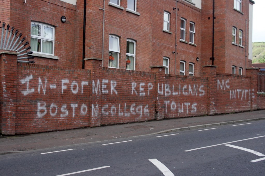 “In-Former Republicans – Boston College touts – McIntyre”. The graffiti refers to the Boston College oral history project, directed by Ed Moloney and involving former IRA volunteer Anthony McIntyre (who now writes at The Pensive Quill), a collection of interviews of former members of paramilitary groups (on both sides) between 2001-2006, some of which the PSNI gained access to after legal action and which are reported to have formed the basis of Gerry Adams’s interrogation (see Get The Real Story). More background from the BBC.