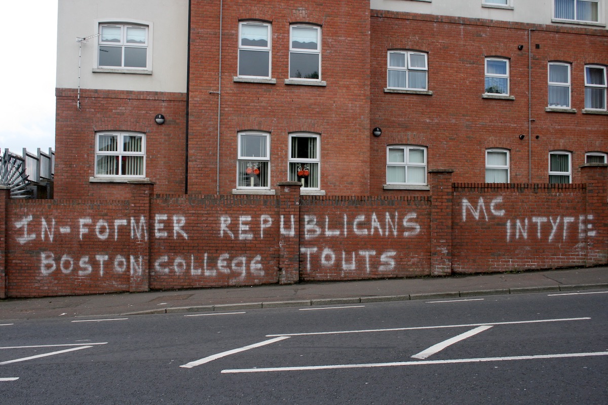 “In-Former Republicans – Boston College touts – McIntyre”. The graffiti refers to the Boston College oral history project, directed by Ed Moloney and involving former IRA volunteer Anthony McIntyre (who now writes at The Pensive Quill), a collection of interviews of former members of paramilitary groups (on both sides) between 2001-2006, some of which the PSNI gained access to after legal action and which are reported to have formed the basis of Gerry Adams’s interrogation (see Get The Real Story). More background from the BBC.