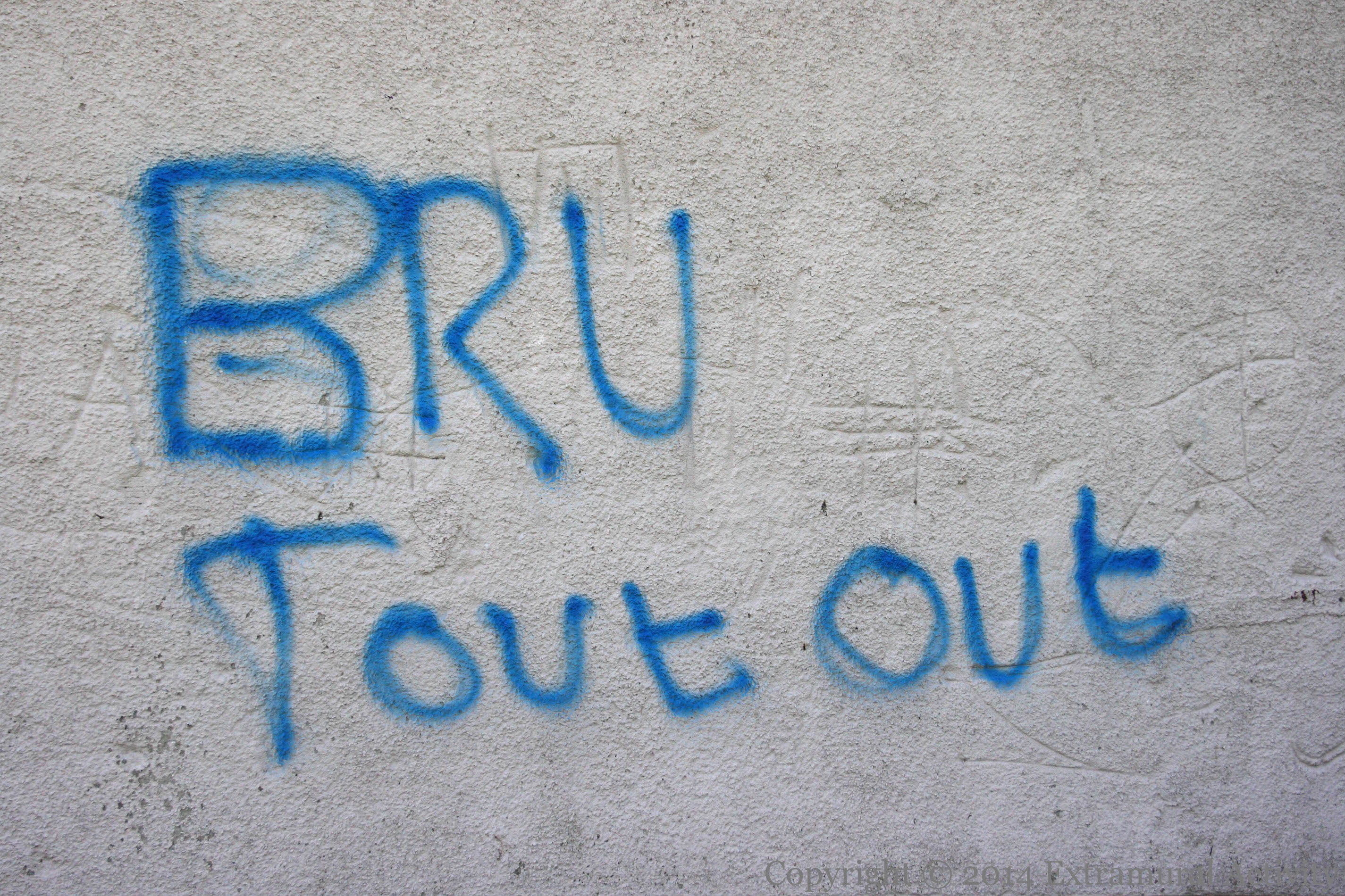 Graffiti in the Highfield estate complaining about/threatening someone allegedly reporting [touting] others to the authorities about unemployment claims [bru, brew; the dole].