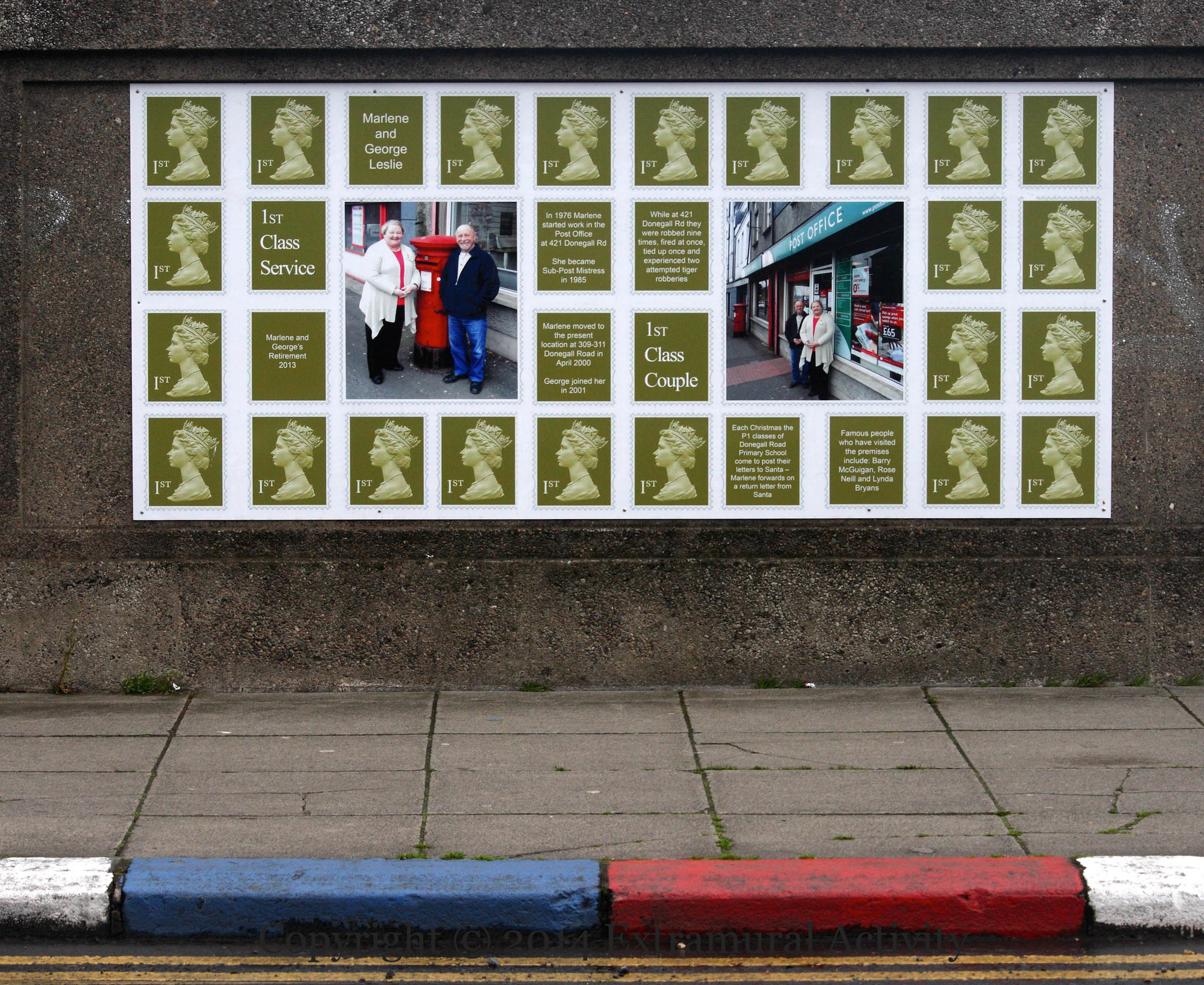 “Marlene & George Leslie’s retirement 2013. In 1976 Marlene started work in the Post Office at 421 Donegall Road. She became sub-post mistress in 1985. Marlene moved to the present location at 309-311 Donegall Road in April 2000. George joined her in 2001. While at 421 Donegall Road they were robbed nine times, fired at once, tied up once and experienced two attempted tiger robberies. Each Christmas the P1 classes of Donegall Road Primary School come to post their letters to Santa – Marlene fowards on a return letter from Santa. Famous people who have visited the premises include: Barry McGuigan, Rose Neill and Lynda Bryans.”