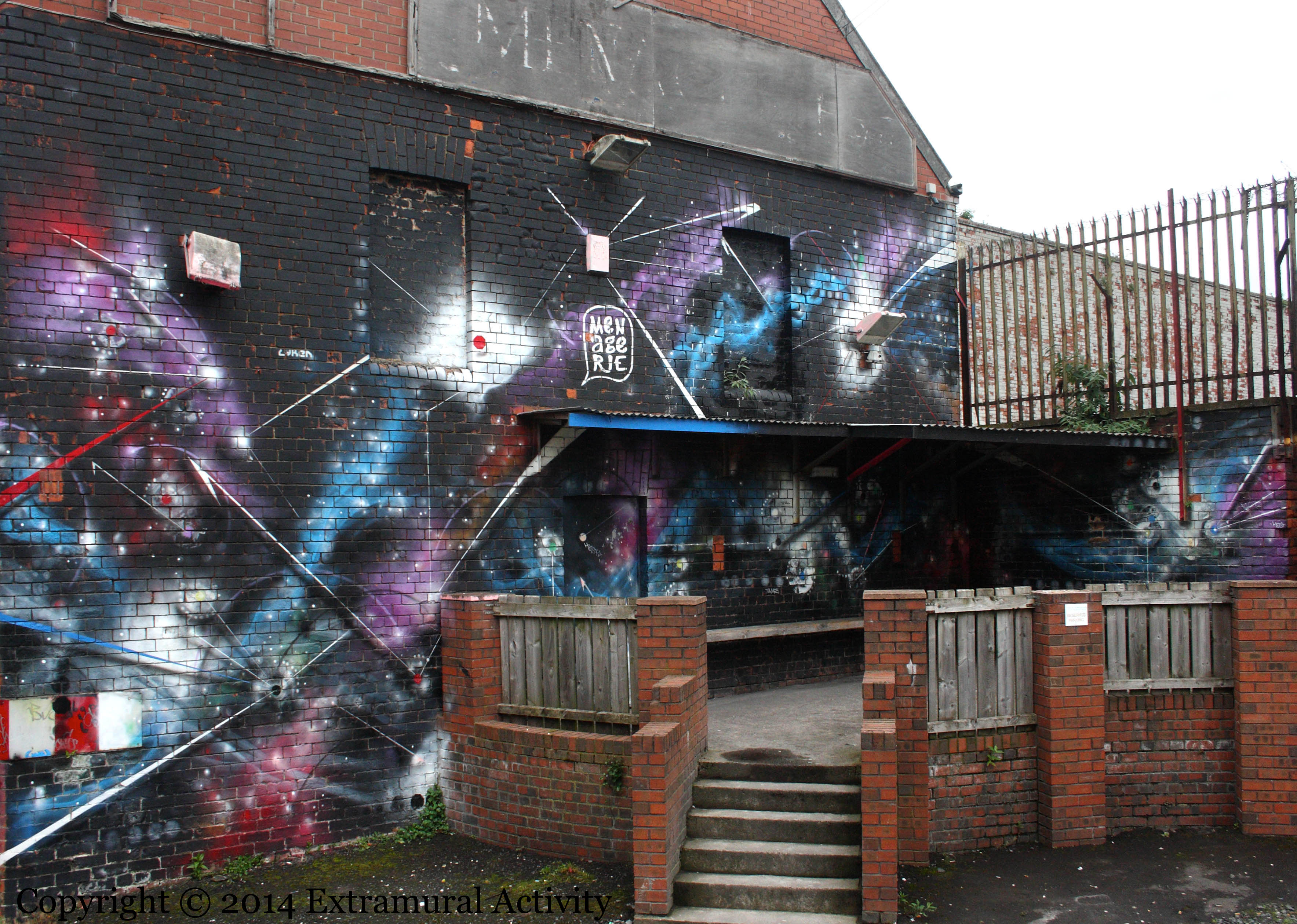 Out-of-this-world work by Scottish artist (Mark) Lyken (Twitter | Fb) – signature at the top, in the middle – on the front of Menagerie (Tumblr) on University Street. Wide shot below.