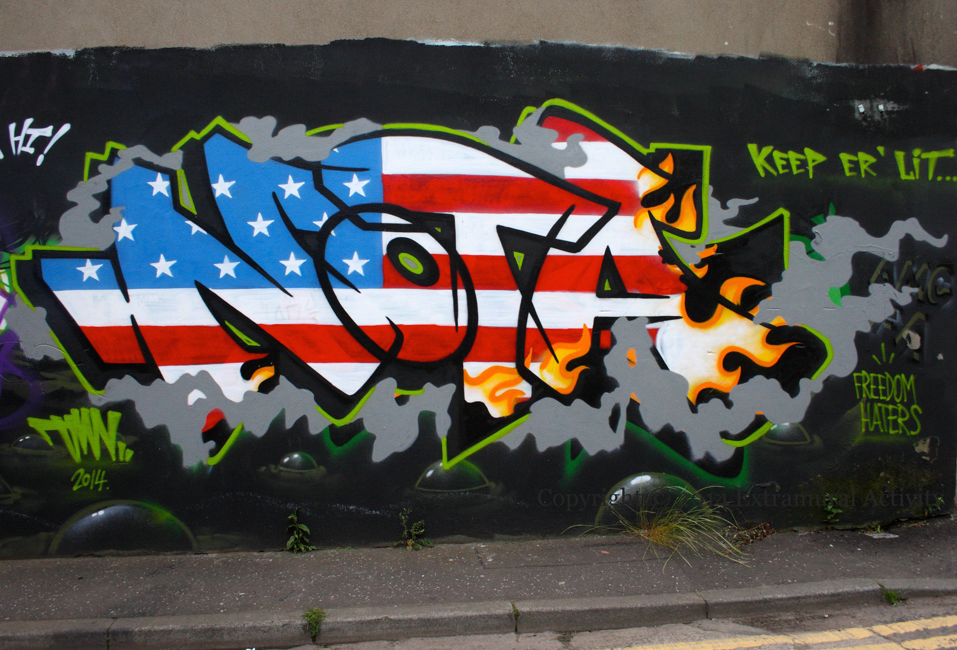 Street art on Unity Walk (between North Street and Kent Street) by NOTA (“none of the above” – his web site appears to have disappeared and there’s nothing for TMN – The Most Nasty) showing a US flag in flames.