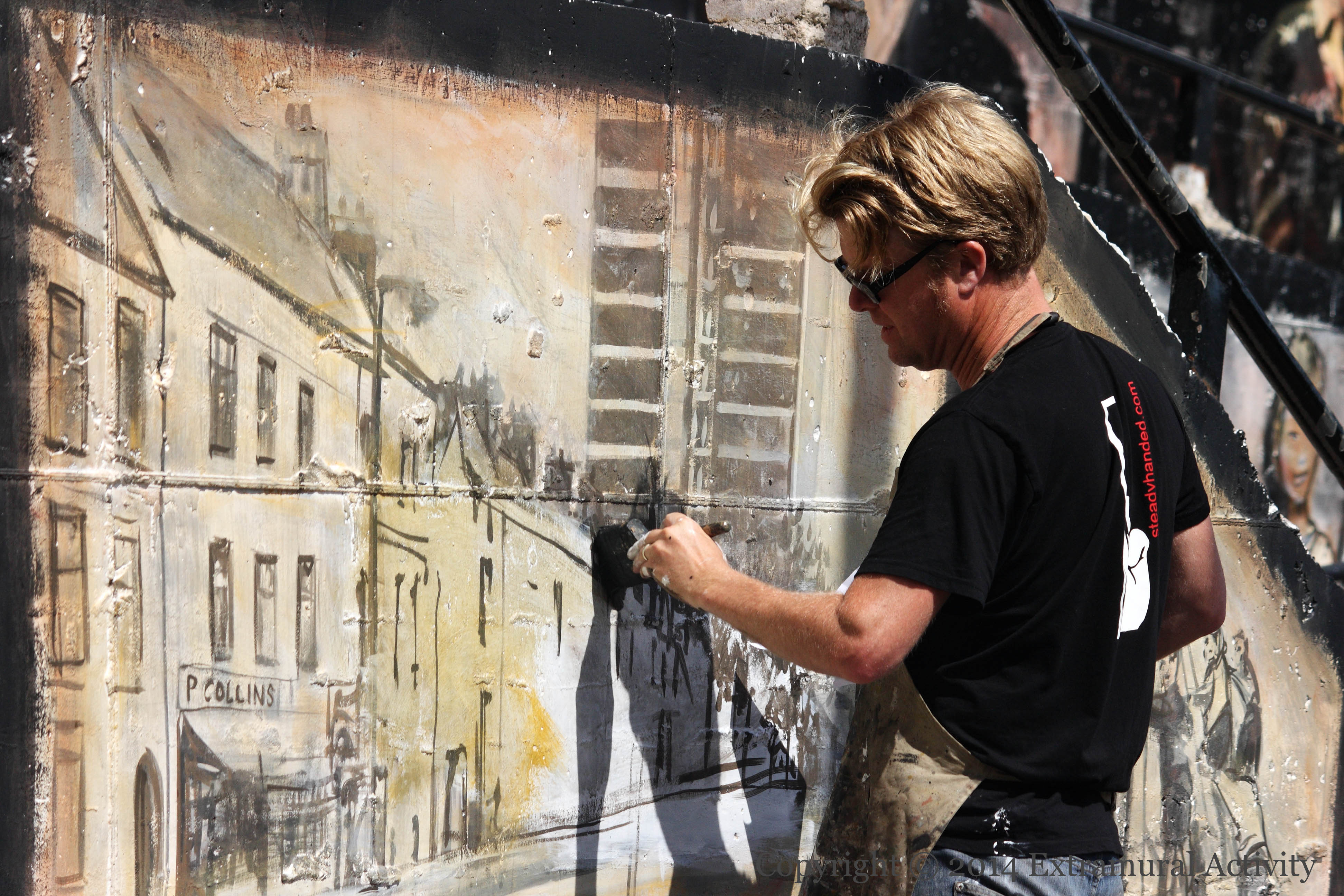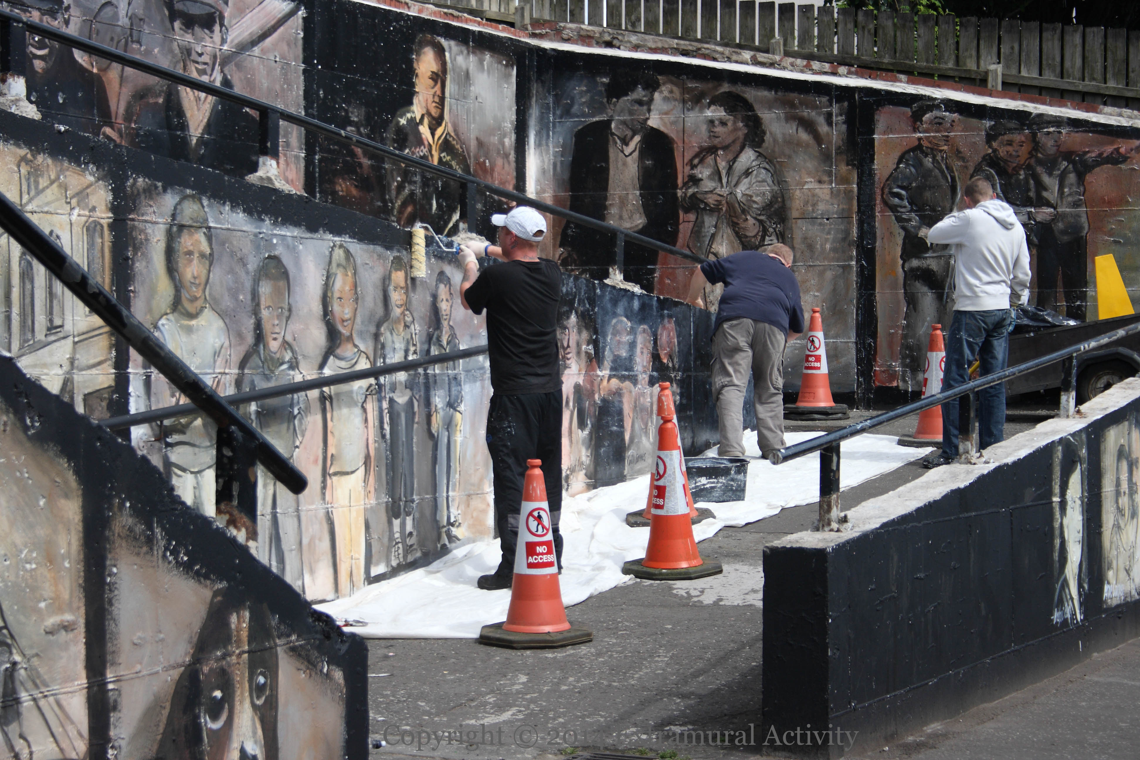 Here is a final set of images of the New Lodge community mural, painted by Ed Reynolds. Above is a detail from one of the panels. Below are a wide shot of the whole, a picture of Ed repairing the vandalism which can be see towards the left of the wide shot, and finally one of the crew covering the piece in an anti-graffiti varnish.