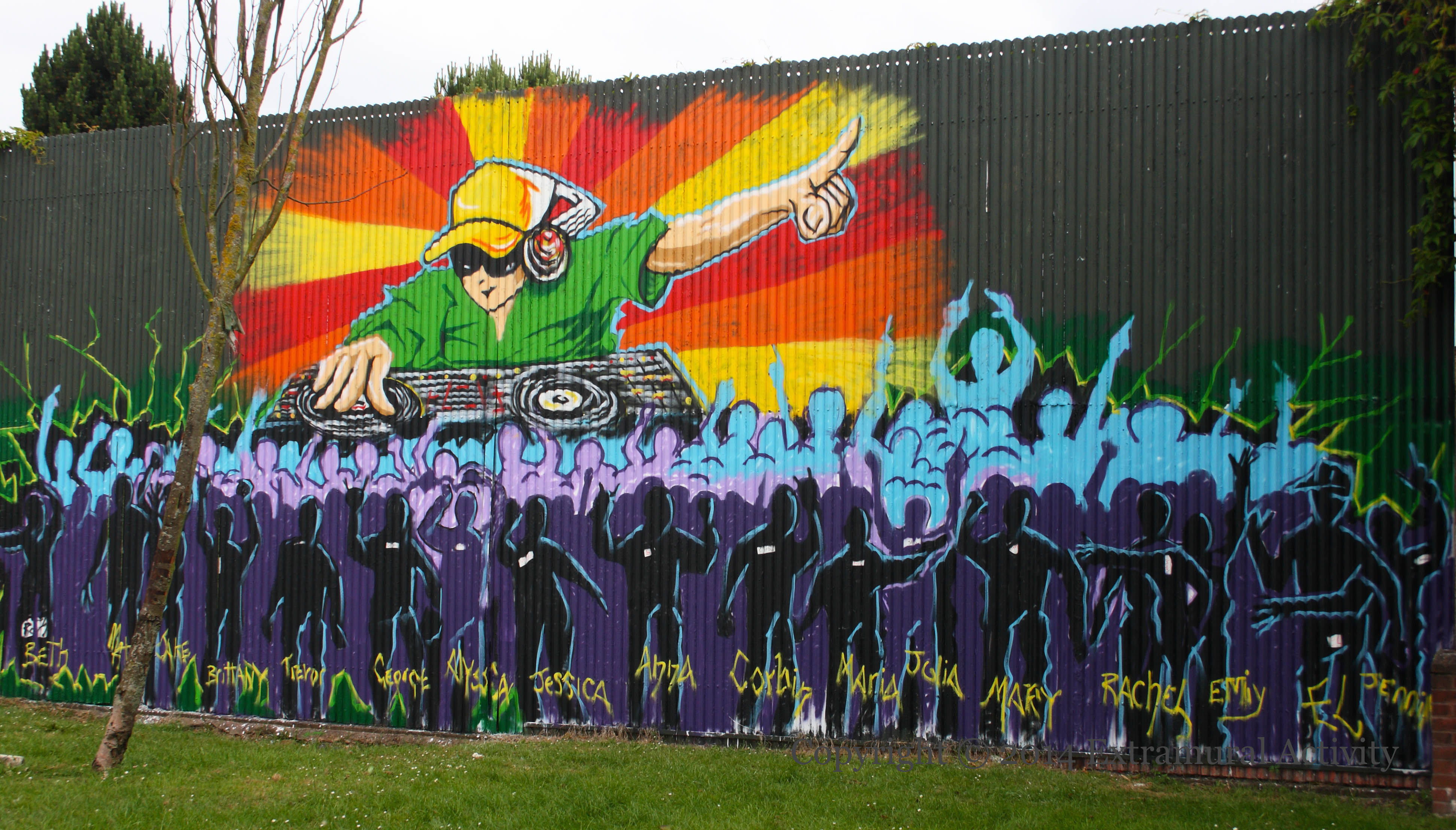 This mural is on the Ardoyne-Glenbryn “peace” wall, on the Alliance Avenue side, showing a DJ with two turntables and a crowd of local (cross-community?) youths: Beth, Mat(?), Jake, Brittany, Trevor, George, Alyssa, Jessica, Anna, Corbin, Maria, Julia, Mary, Rachel, Emily, El(?), Jennifer. If you have any information about this mural, please comment or send an e-mail.