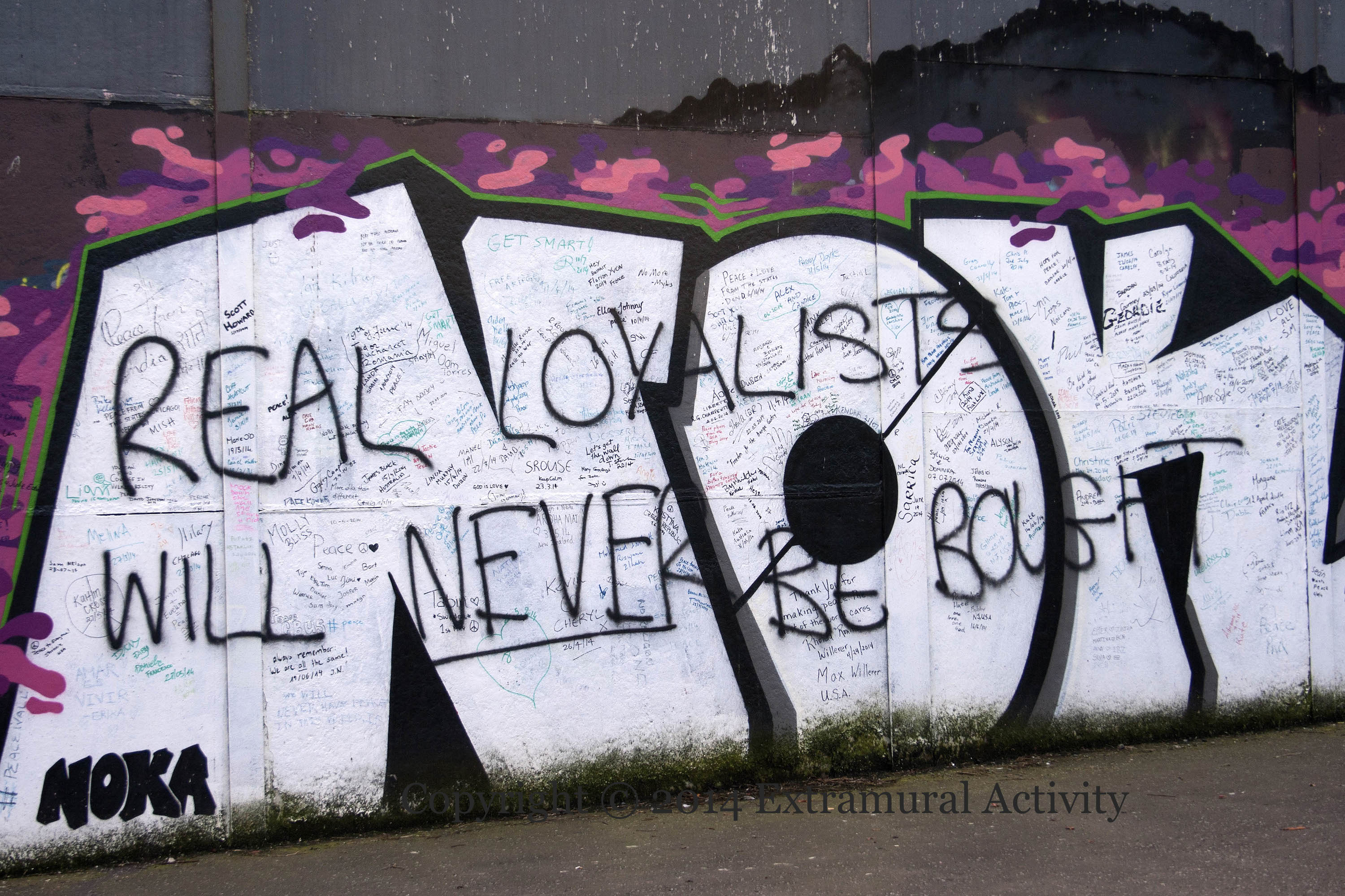 Loyalist graffiti on the topic of money for regulated bonfires and community celebrations (for more, see Culture Before Cash), atop a piece of spray-paint writing by Noka, one of the FA Krew.
