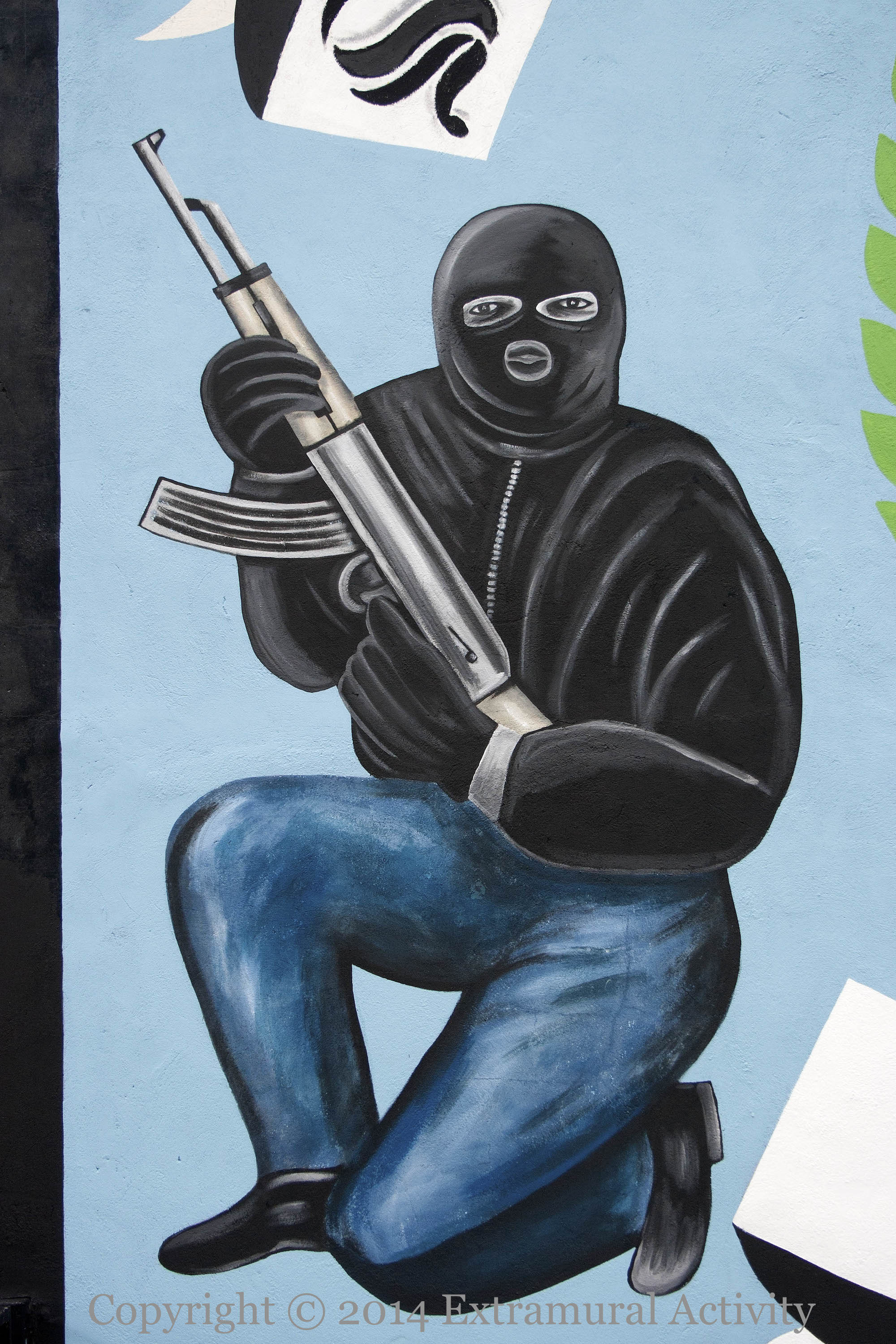 Two masked men with assault rifles flank the red fist and white star emblem of the Ulster Freedom Fighters. The figure on the left is shown in detail below. The South East Antrim UDA’s tumultuous history is substantial enough to warrant its own WP page.