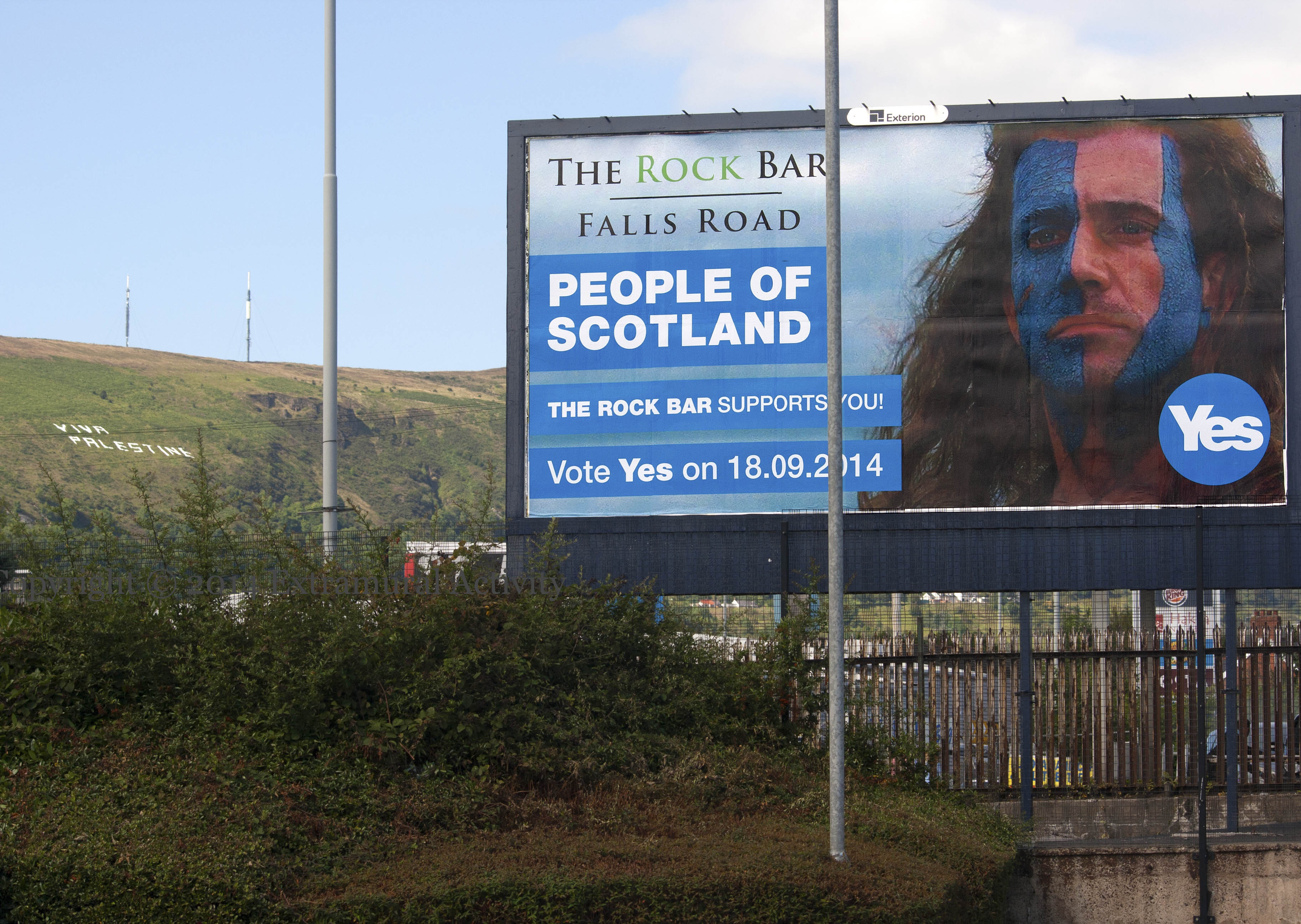 Scots and other residents of Scotland go to the polls on September 18th to vote on independence (WP). The Rock Bar uses the image of Mel Gibson in Braveheart to encourage them to vote “Yes’; recent polls show a slight but persistent preference for a “no” response. In the background of the wide shot (below), the Viva Palestine lettering can still (2014-08-26) be seen on Slıabh Dubh/Black Mountain.