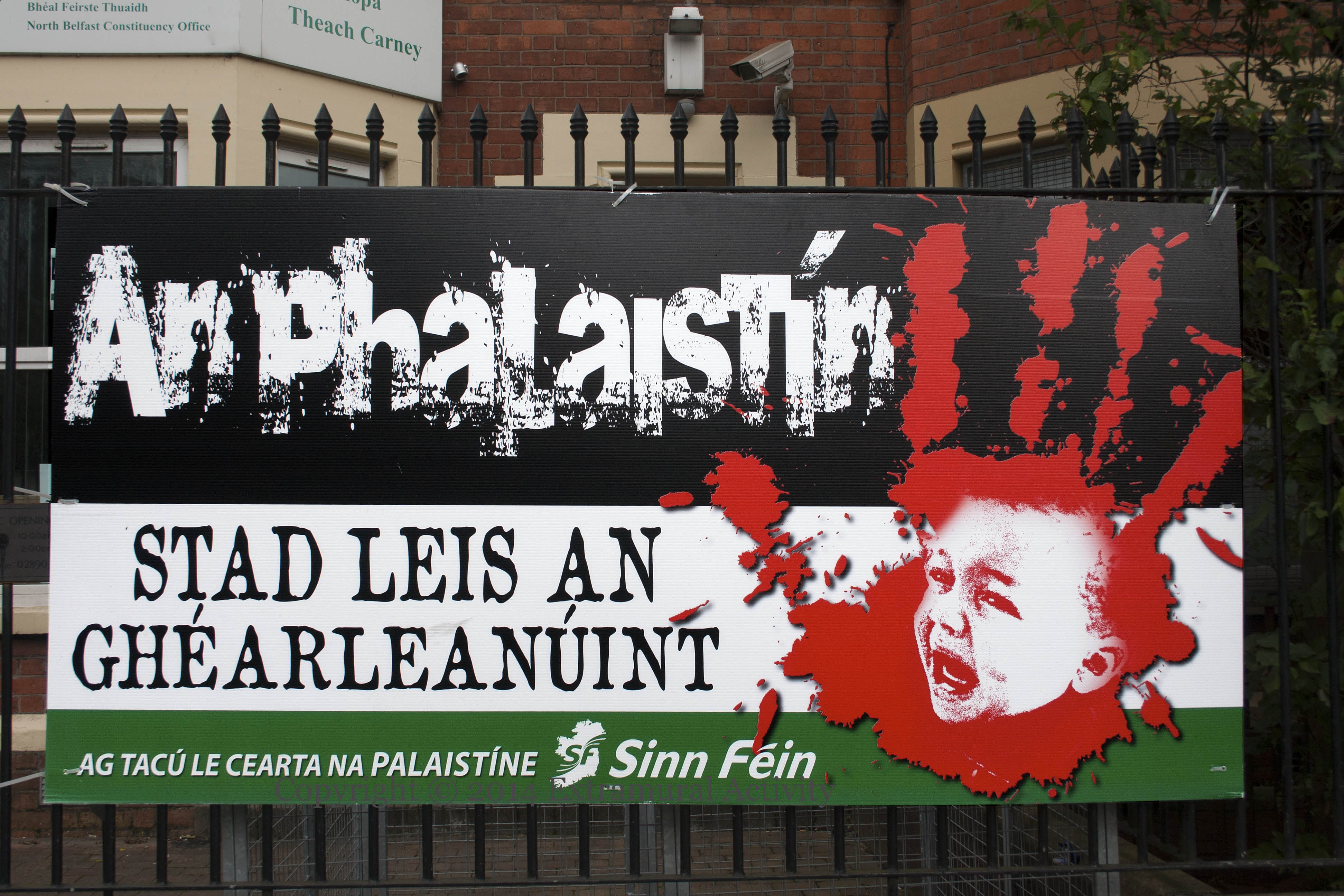 Pro-Palestine board outside the north Belfast Sınn Féın office on the Antrim Road showing a bloody hand-print and the face of a crying child: “Stad leıs an ghéarleanúınt – ag tacú le cearta na Palaıstíne” : “Stop the persecution – supporting Palestinian rights”. The close-up of the hand and face, below, is taken from an English-language version of the board in Beechmount Street. The third image is of the same board at the Glen Road/Andersonstown Road junction.