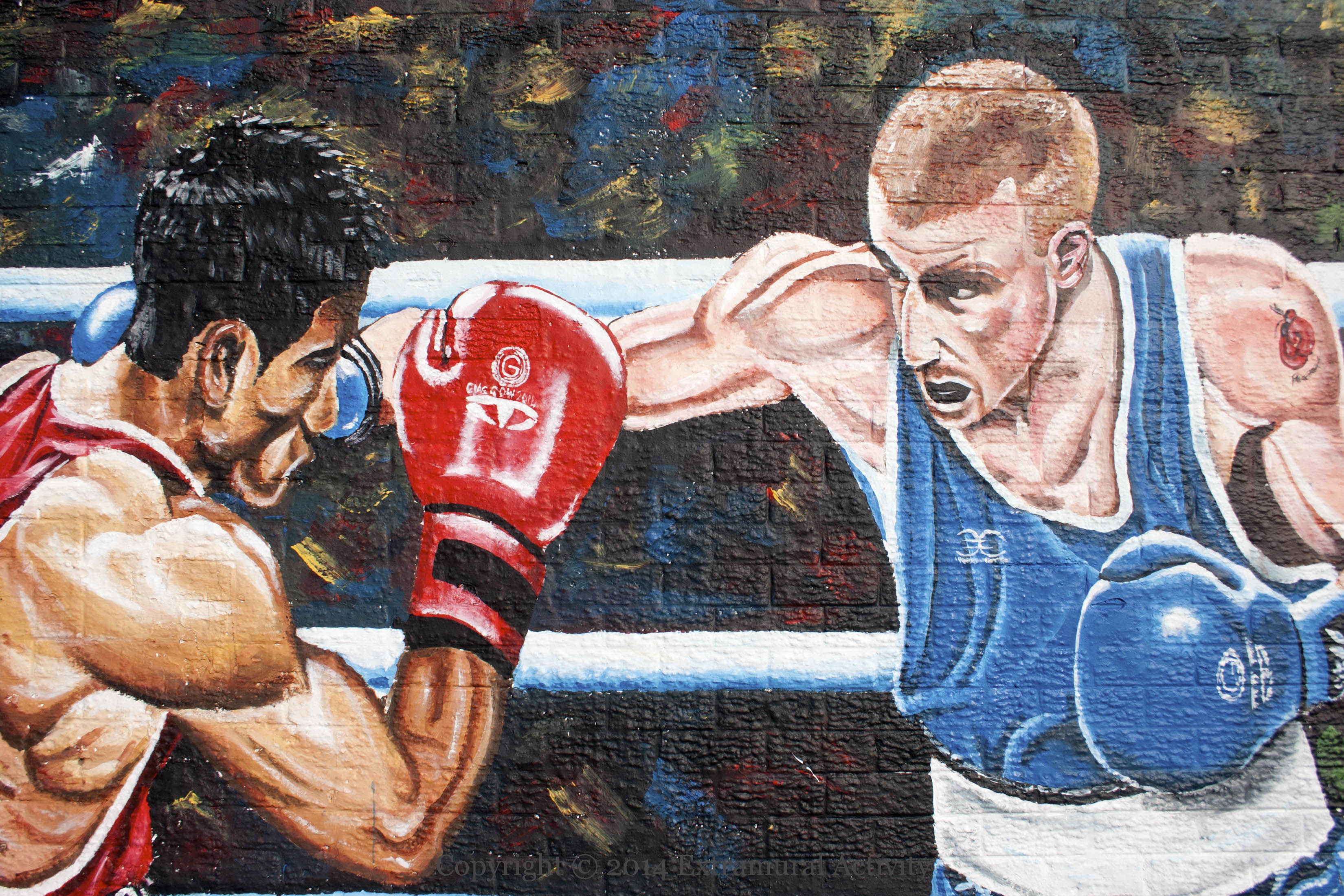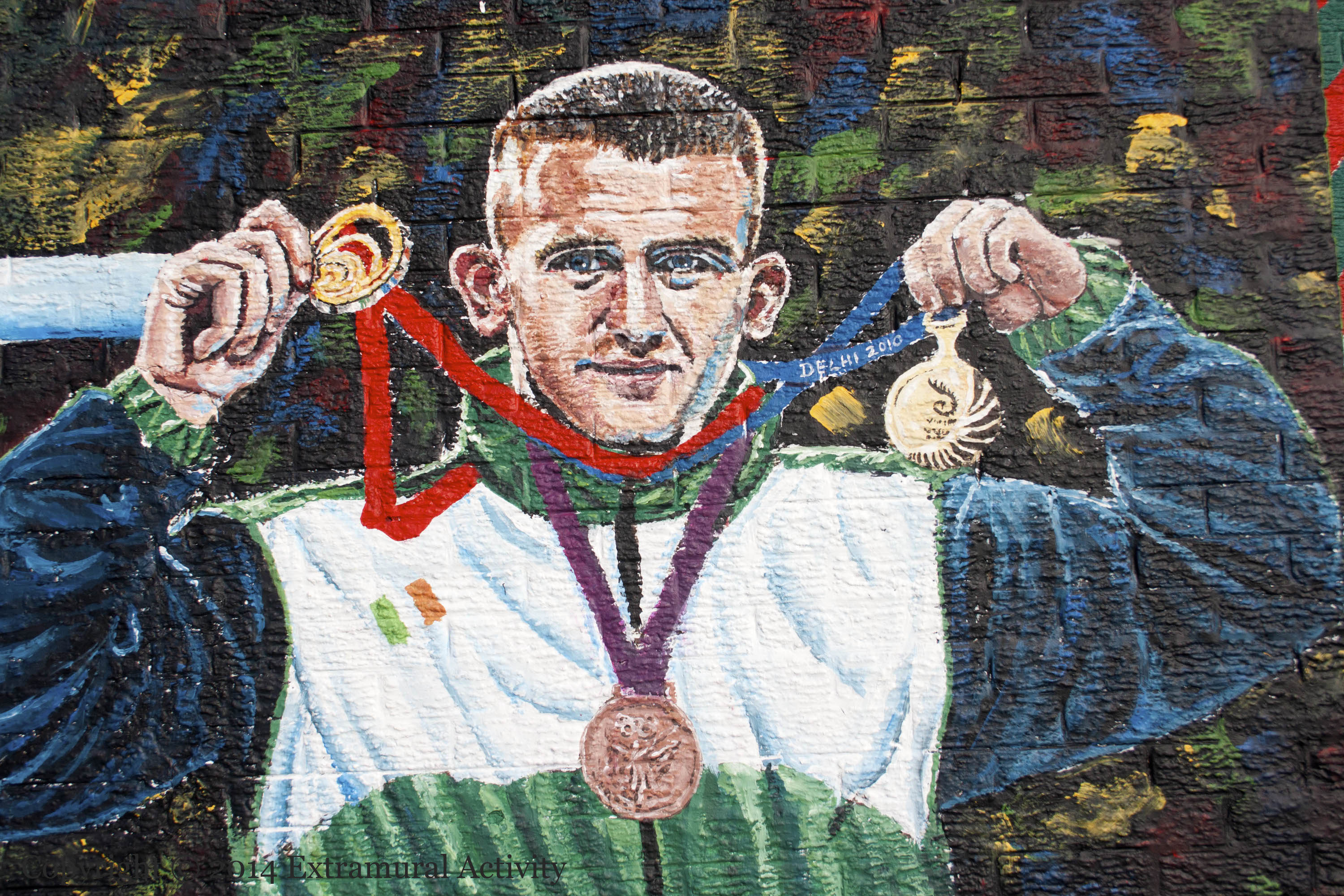 Paddy Barnes fights India’s Devendro Singh Laishram in the light flyweight gold-medal bout at the 2014 Commonwealth games in Glasgow. Barnes won gold, successfully defending his title and adding to his collection, shown in the second image (below) and listed at the bottom of the mural (third image, below). Barnes sparked controversy when he remarked, as the Londonderry Air/Danny Boy was played as the Northern Irish “anthem”, “That’s not my national anthem.”. The mural is in Barnes’s home area of Ardoyne/Ard Eoın and was painted by Lucas Quigley and Mickey Doherty.