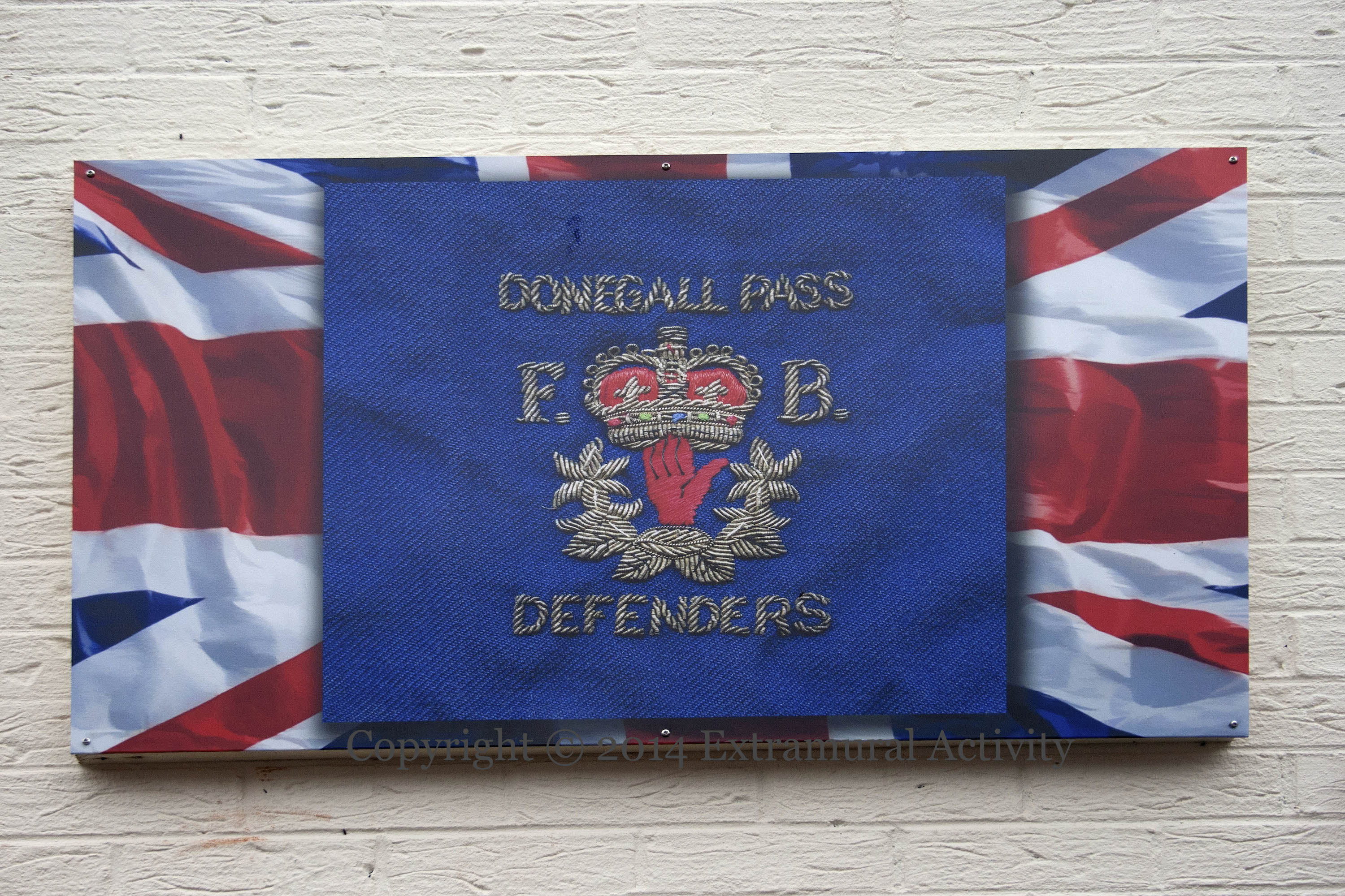 Here are close-ups of the two boards to either side of the new Young Conquerors piece (featured recently in Veni, Vidi, Vici). The first shows a photograph of the original Donegall Pass Defenders Flute Band, which lasted a short time in the 1970s before the formation of the Conquerors in 1977 (Fb). The second shows the patch of the band.