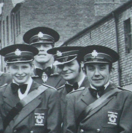 Update (2015-01): Nikki has kindly sent us an image of the band parading, taken sometime in the 1970s. Her grandfather, Thomas Lorimer, recently passed away and she found the picture in his roof space. He was a member of the Defenders and is at the far left of the picture, on the bass drum. She was also able to identify him in the posed picture from the board – shown in detail below; he is the tall gent in the back.