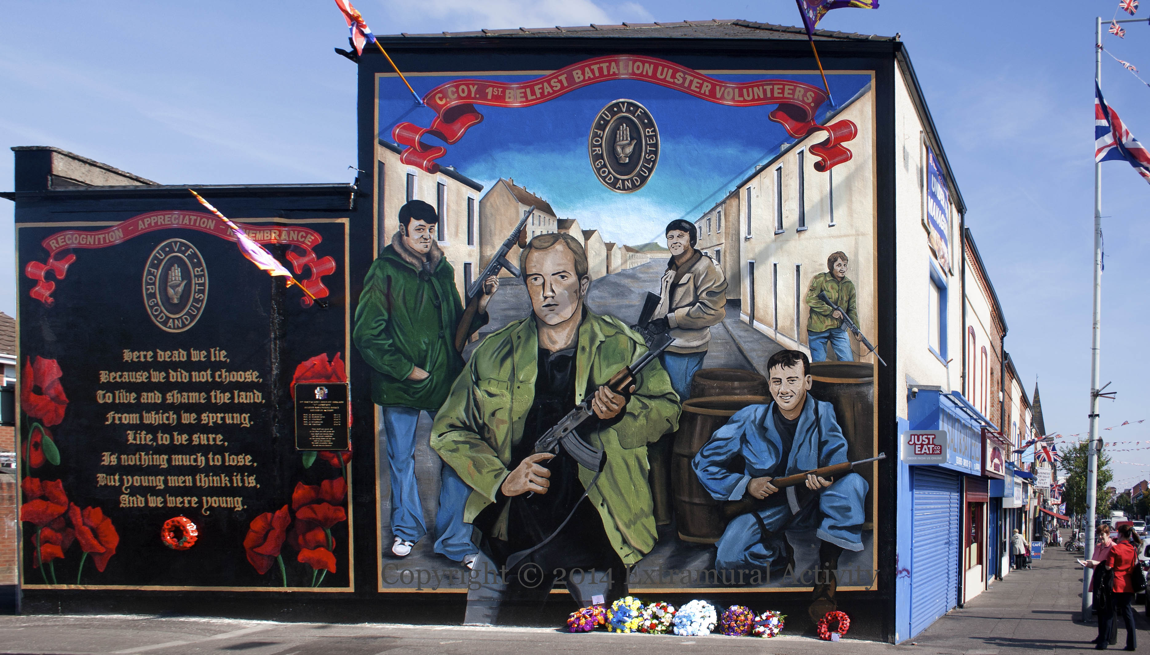 A. E. Housman’s 1919 short poem “Here dead we lie” is featured, together with the poppies that grew on the Western Front in WWI, in this UVF commemorative mural. The 36th (Ulster) Division is not mentioned specifically; the plaque on the right-hand side (which pre-dates the mural) lists the names of five UVF members killed in the 70s who are depicted in the mural just out of picture but seen below in a wide shot of both murals (and by itself in C Coy Street). For a similar connecting of the two Ulster Volunteer Forces, see 100 Years Apart, Armed & Ready, Years Of Sacrifice, and others. Another wide shot is given in C Coy Street, taken from the main road and shows that the fish-and-chip shop on the Shankill is called “A Salt And Battered”.