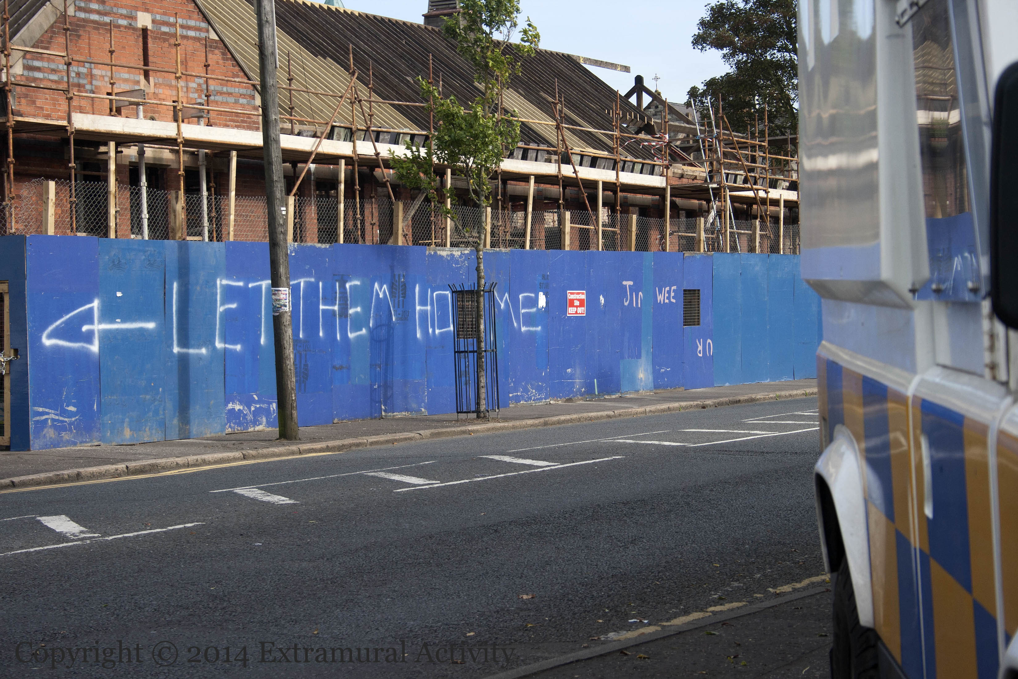 This graffiti on the hoardings around the building-site at the top of Woodvale Road is in reference to the on-going dispute at Twaddell Avenue, which is just to the right of the PSNI land-rover in the right of frame – each night Orange bands march up to the police line, attempting to march past the Ardoyne shops and finish a parade from the Twelfth (of July) 2013.