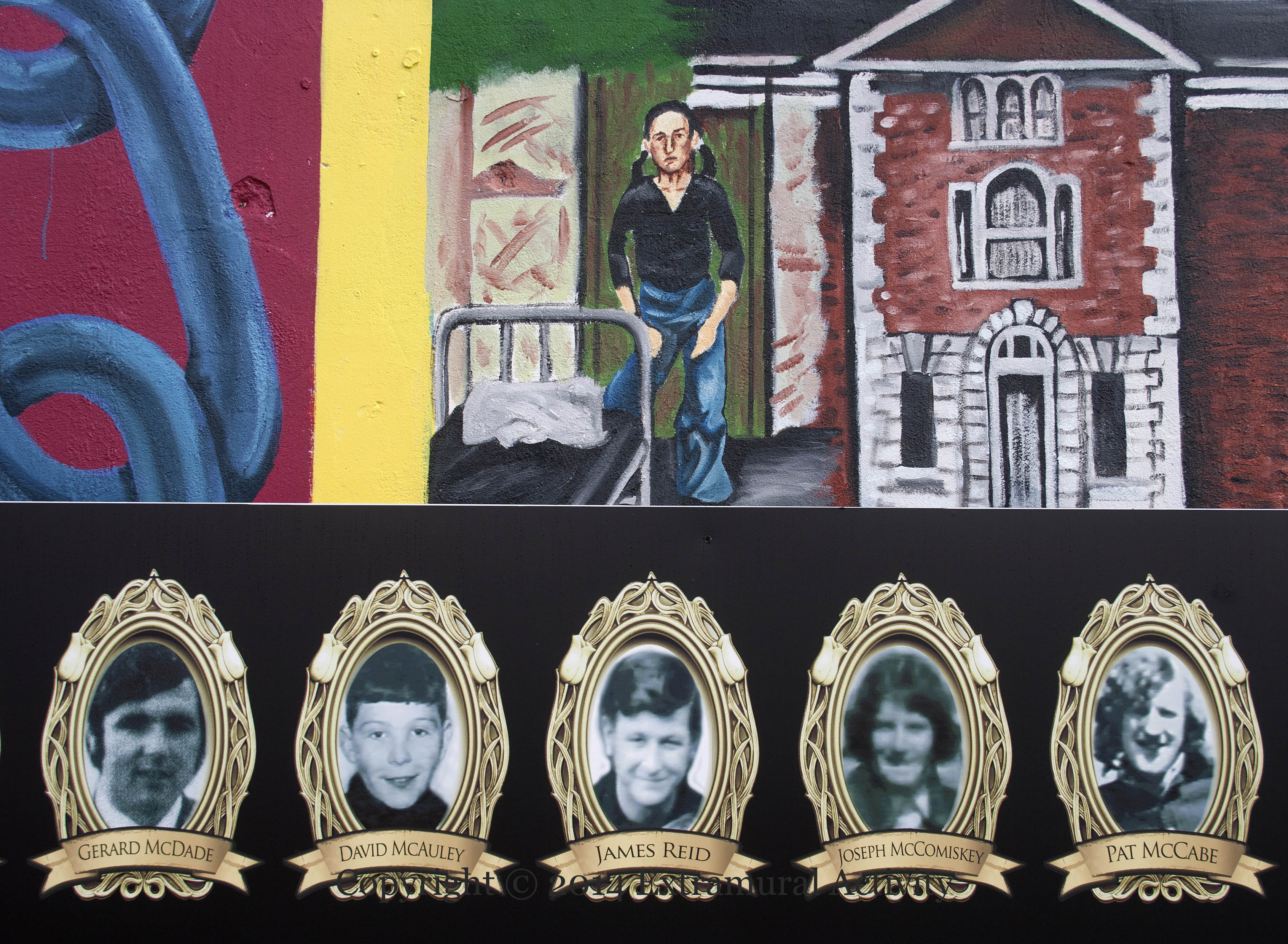 Here are two details from the Ardoyne, Bone, Ligoniel mural featured yesterday, as well as a shot of bouquets of flowers in front of the plaque on the stone put in place in 2003. The first reproduces a photograph of Maıréad Farrell during the “no-wash” or “dirty” protest in Armagh Women’s Prison. (See the middle of this 1989 Frontline documentary.) The second shows the walls and guard-towers of the H-Blocks (featured previously in You Know Where). The frames and photographs of 40 locals are printed, not painted.
