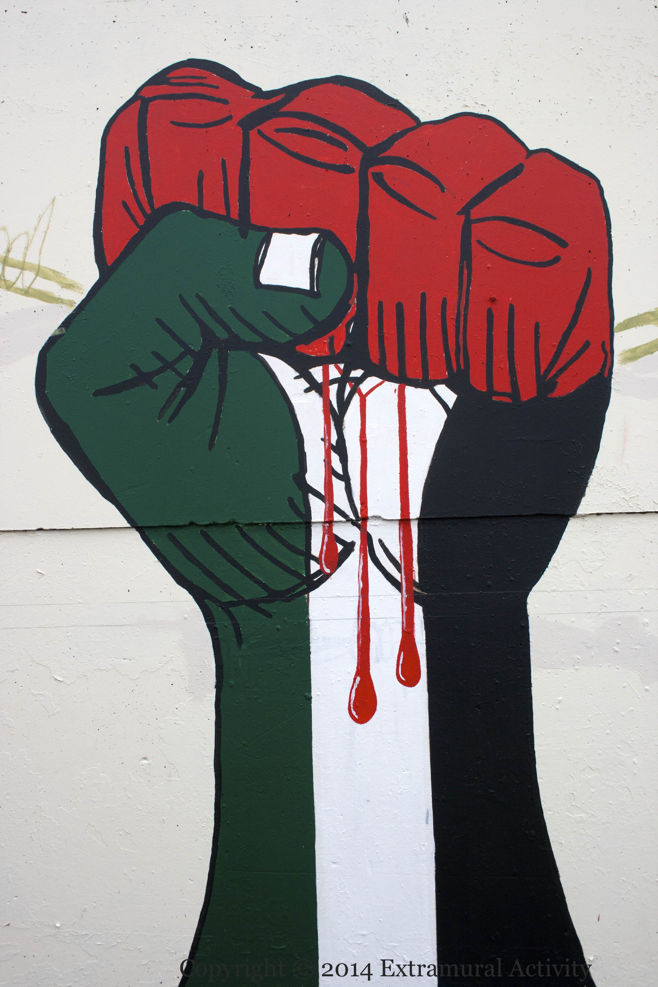 Above is another piece of the multi-panel work by Gerard Kelly (“Mo Chara”) at the top of Springhill, showing a forearm in the colours of the Palestinian flag with a fist clenched around a strand of barbed wire, causing blood to drip down.