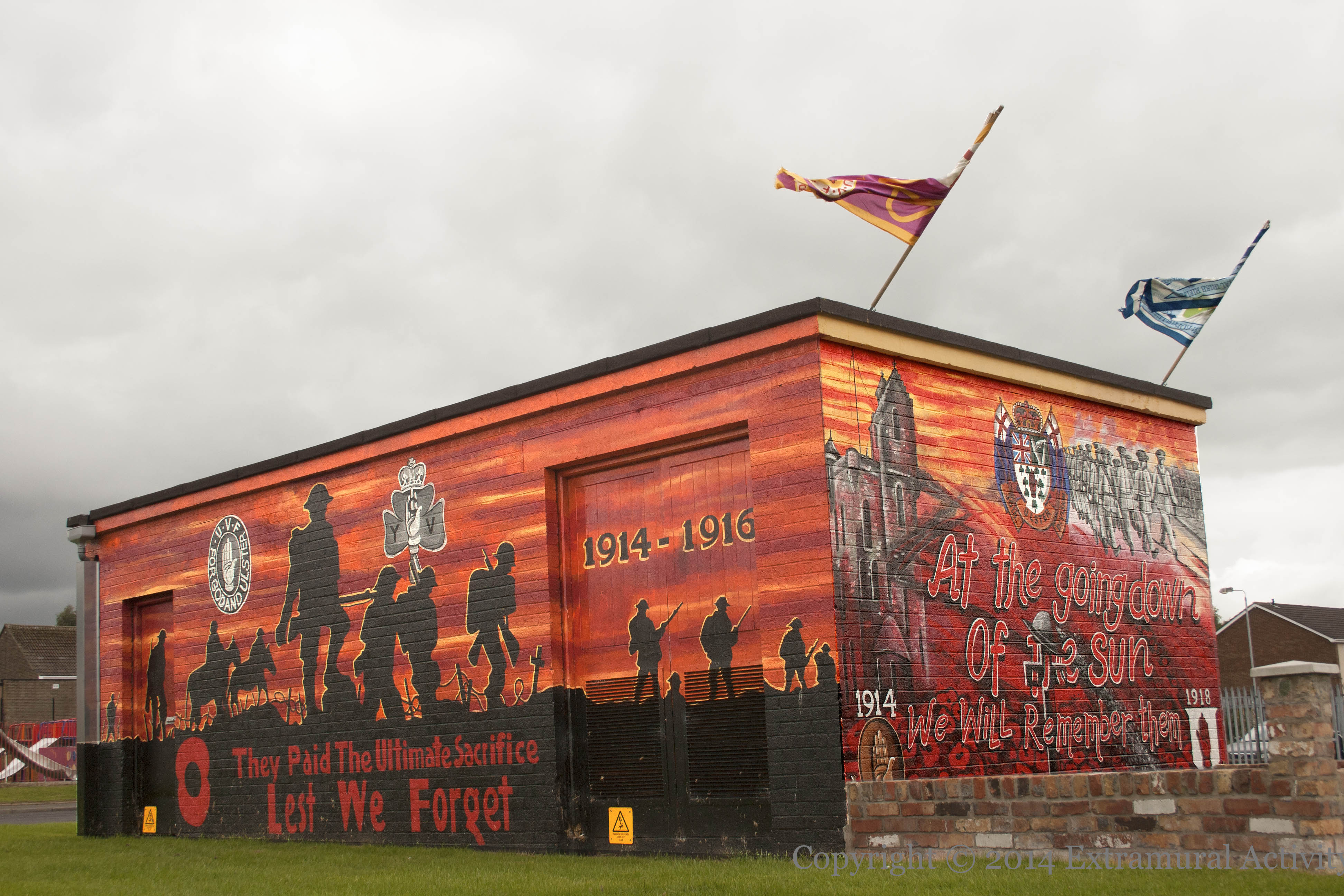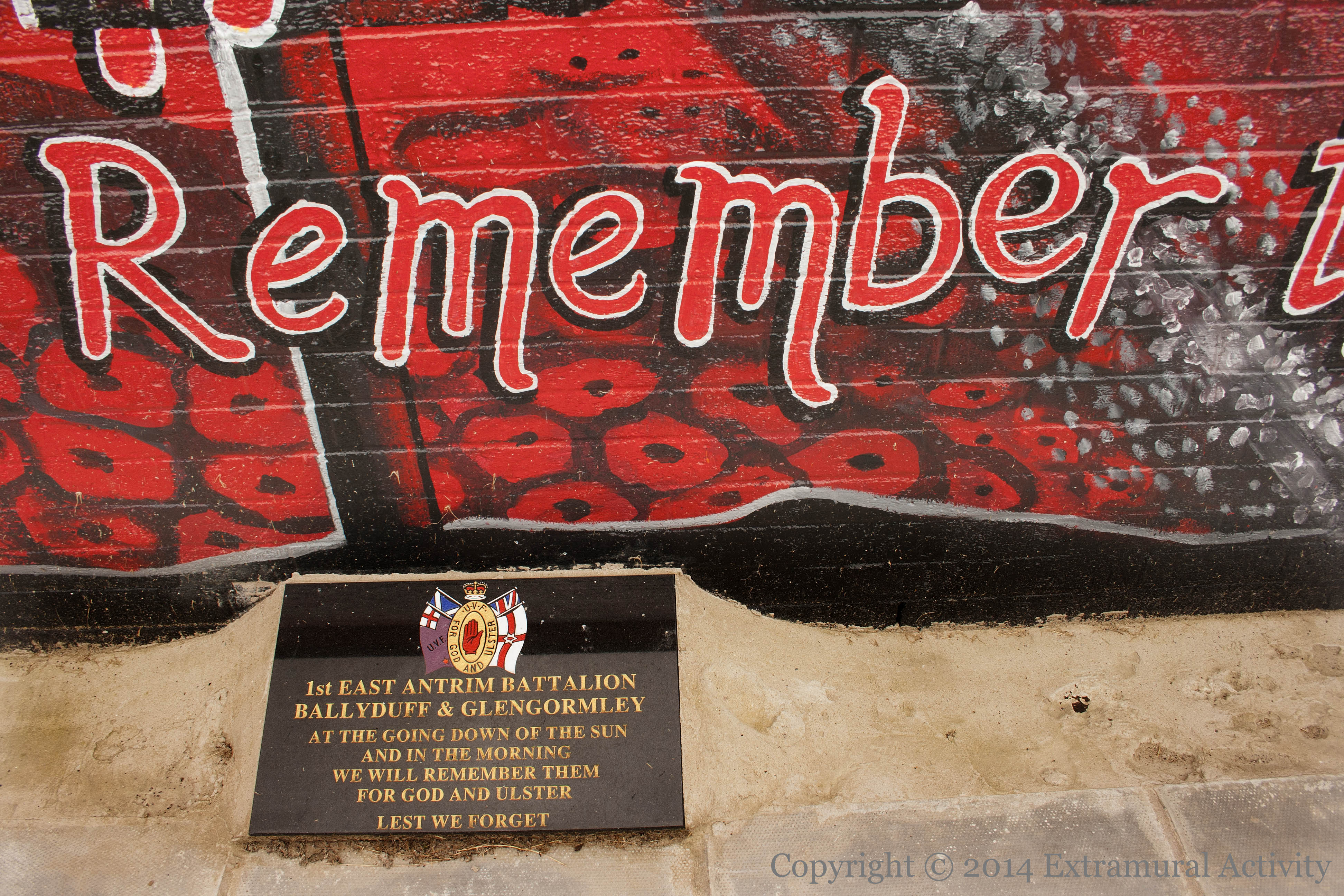 “They paid the ultimate sacrifice”. The UVF/YCV mural above on a Ballyduff electrical station shows WWI soldiers from the 36th (Ulster) Division in relief against an orange sky (perhaps “at the going down of the sun”), picking their way across the battlefields of Flanders. The Ulster Memorial at Thiepval, which commemorates the 5,000 lost lives and more specifically the role of Orange Order members, is shown in the top left corner of the smaller wall. A plaque, hidden behind the low wall to the right but shown below in close-up, indicates sponsorship from the UVF “1st East Antrim Battalion, Ballyduff & Glengormley”.