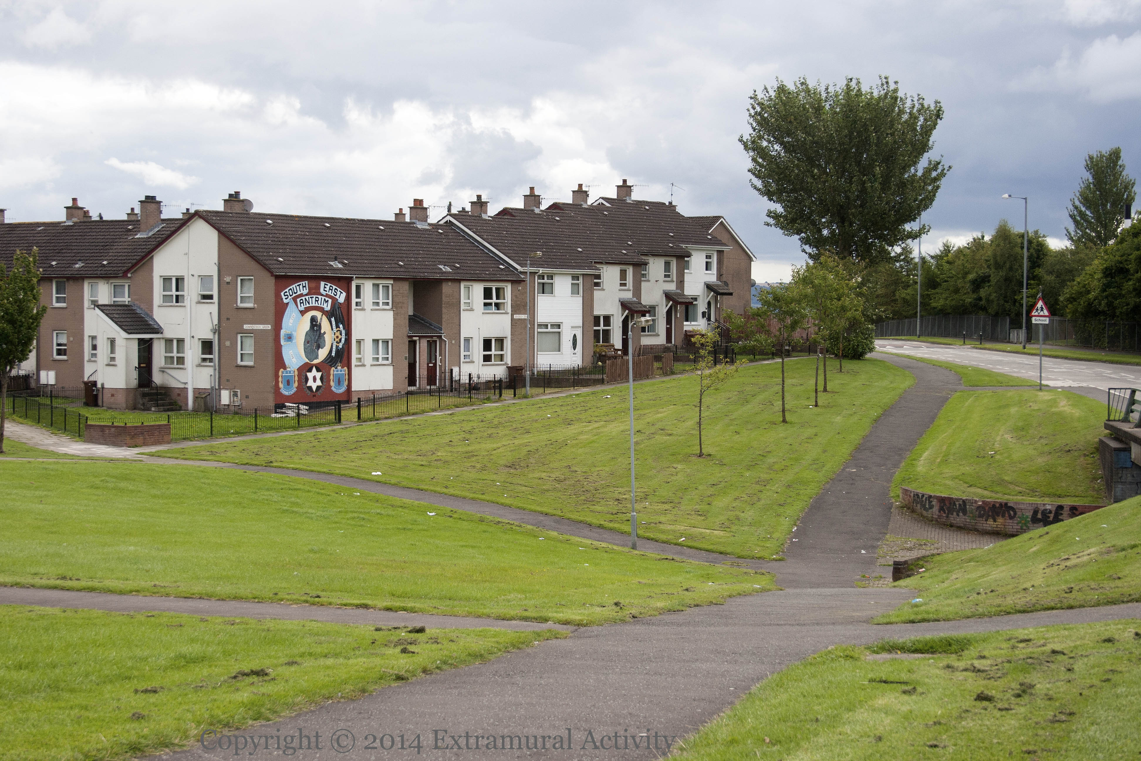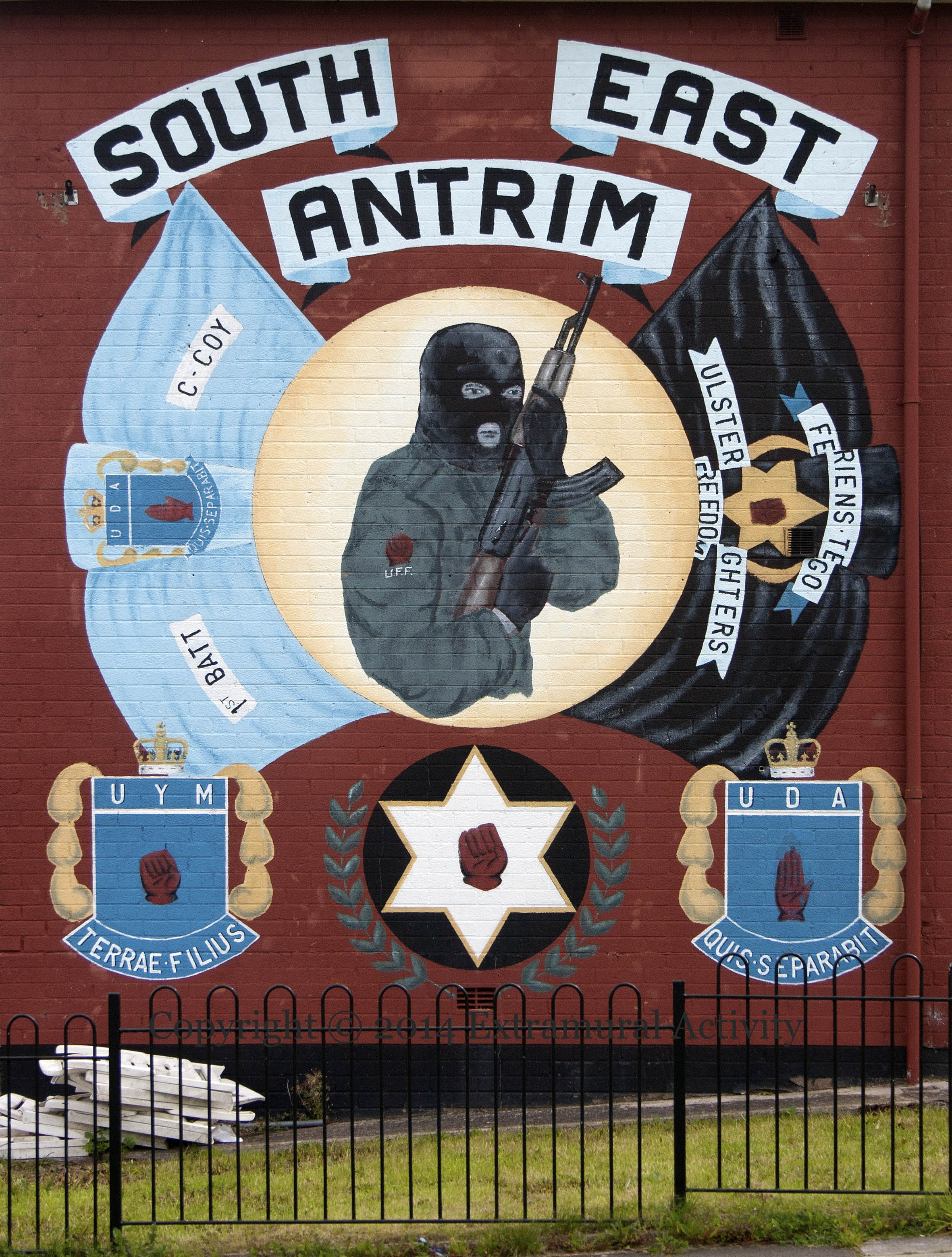 There are both UDA and UVF murals along Devenish Drive in Monkstown. Here we have a UDA hooded gunman, along with insignia and mottoes of the UFF/UDA/UYM. The UFF/UYM with a red hand closed into a fist, the open palm of the UDA; UFF – Feriens Tego; UYM – Terrae Filius; UDA – Quis Separabit.