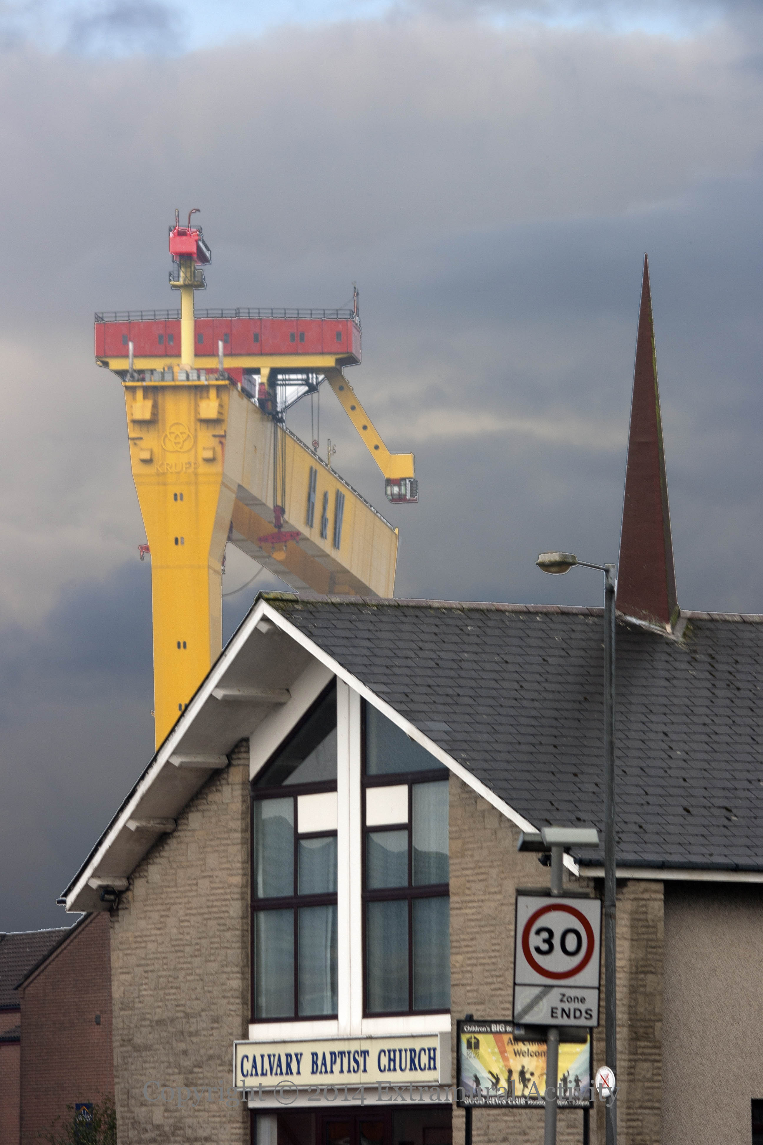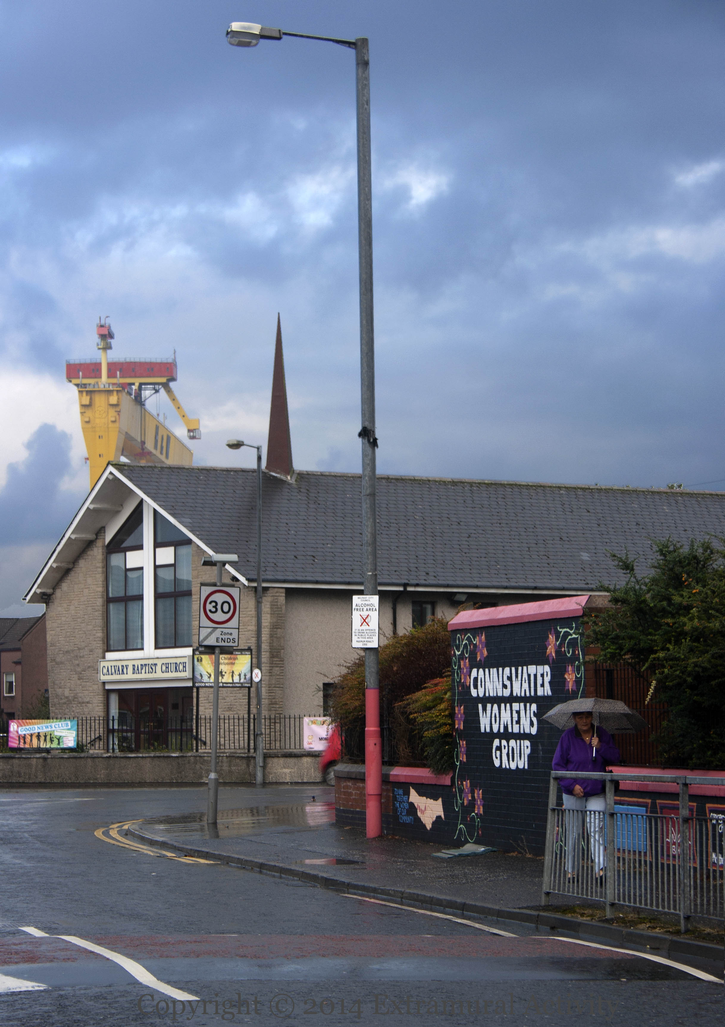 One of the H&W cranes and the spire of Calvary Baptist church (and a street-light) reach to the heavens over the junction of Dee Street and Severn Street and (as the wider shot, below, shows) a “Connswater Women’s Group” mural.