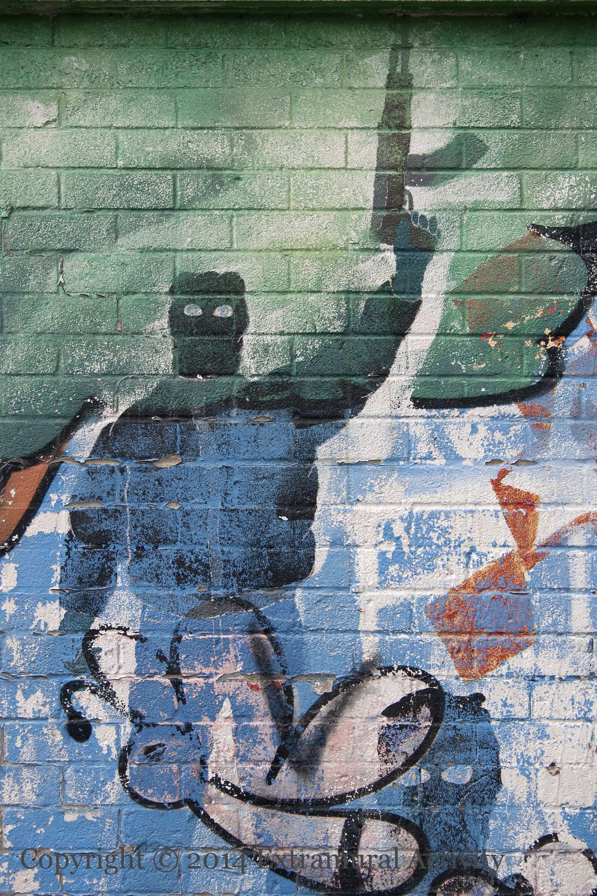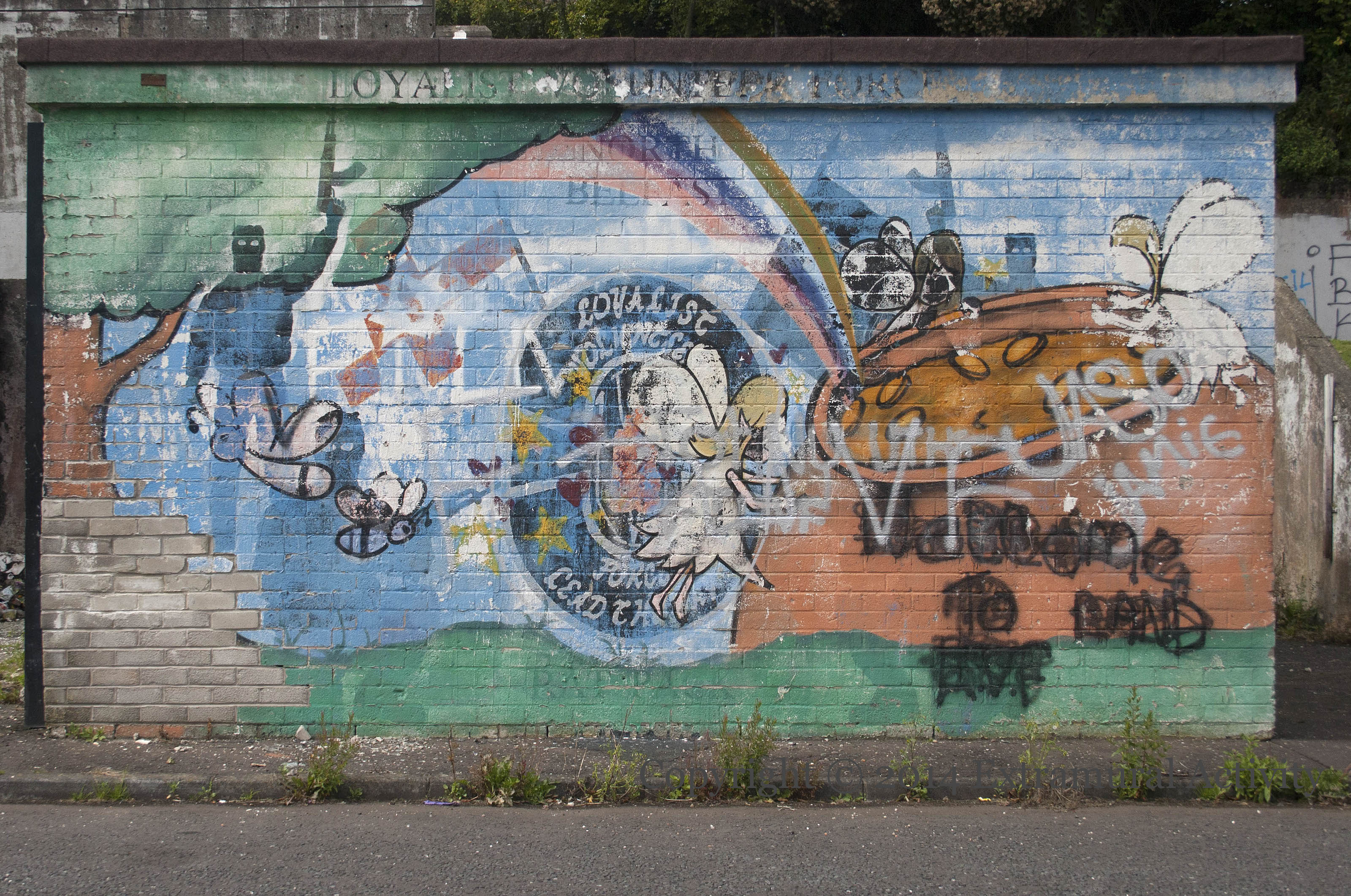 The fairy-tale covering painted over an LVF “North Belfast Rat Pack” mural is fading away to reveal the previous work. For the original LVF mural, see D01199.