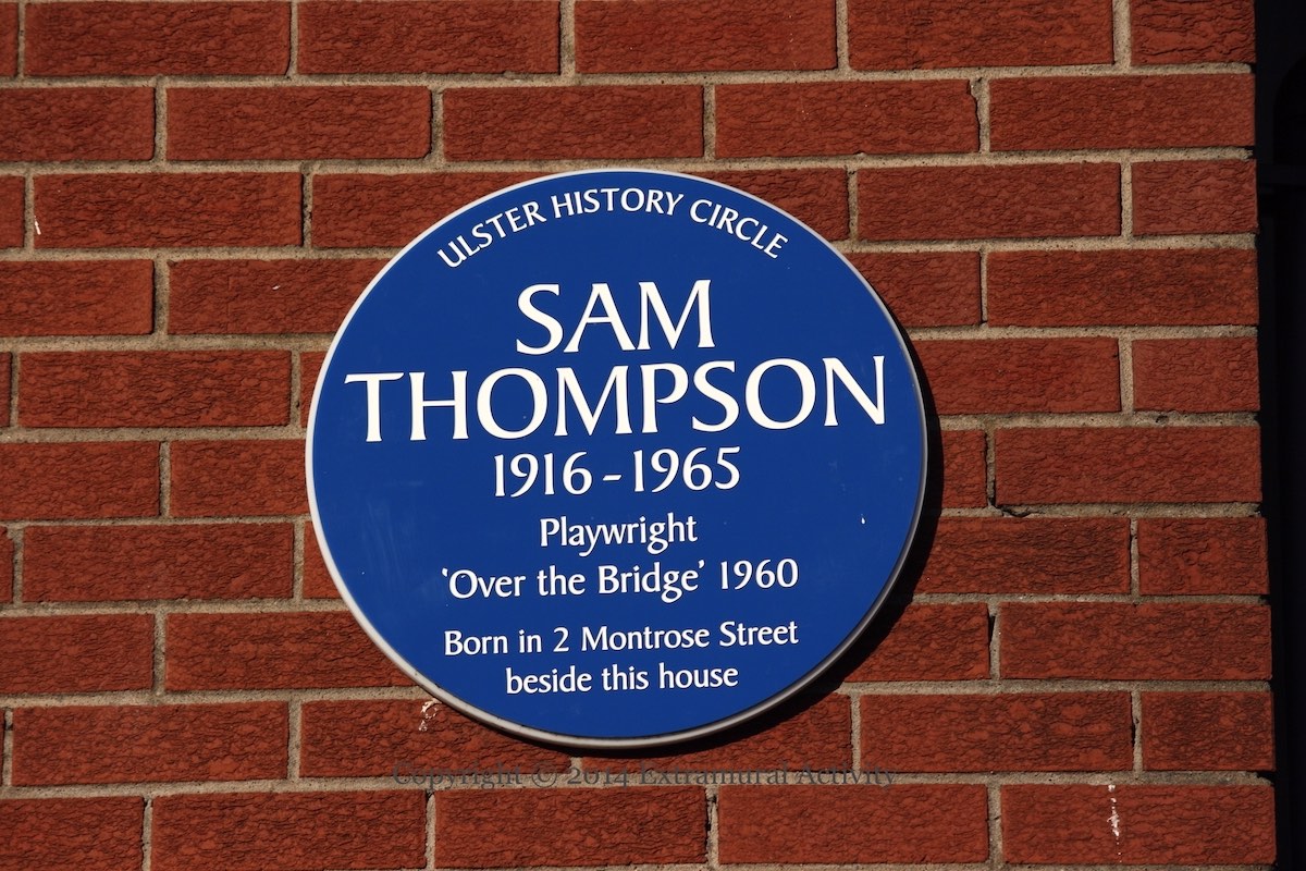 “Sam Thompson 1916-1965 Playwright ‘Over The Bridge’ 1960. Born in 2 Montrose Street beside this house.” In addition to his written works, Thompson was a painter for H&W and the Corporation, a trade unionist and Labour candidate (WP).