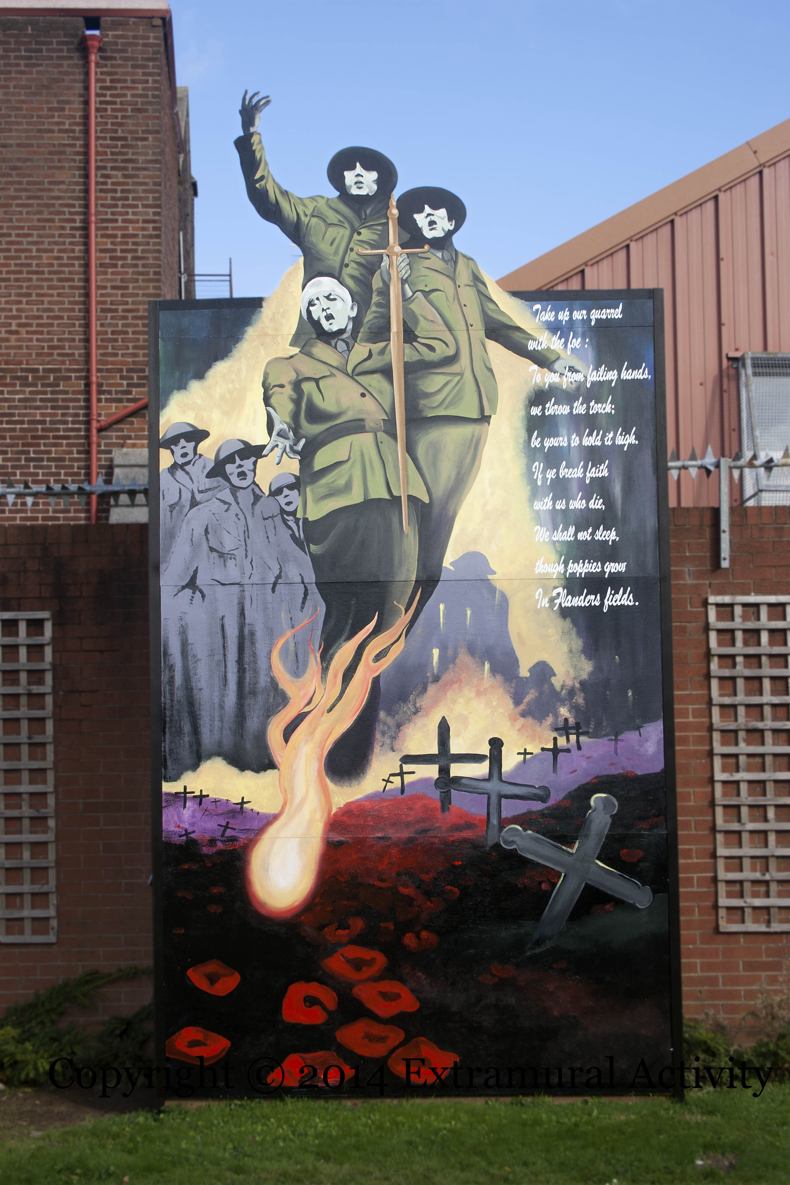 Three wraiths of dead WWI soldiers – one with its head wrapped in a bandage – rise from the grave to issue a final edict: Take up our quarrel with the foe; to you from failing hands we throw the torch; be yours to hold it high. If ye break faith with us who die, we shall not sleep though poppies grow in Flanders’ fields.