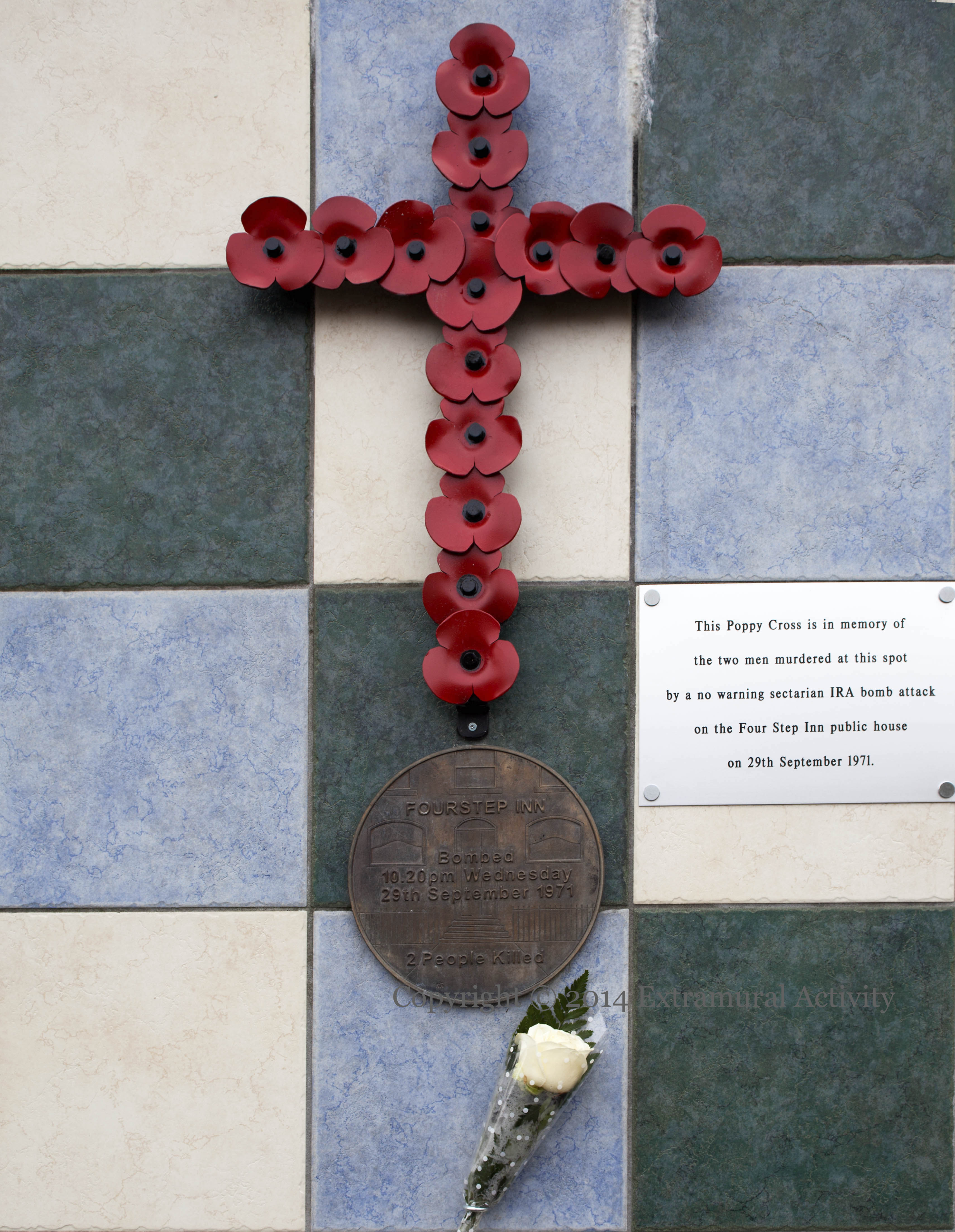 “This poppy cross is in memory of the two men murdered at this spot by a no warning sectarian IRA bomb attack on the Four Step Inn public house on 29th September 1971.” The two men were Alexander Andrews (60) and Ernest Bates (38) (CAIN). A similar cross was also erected further down the Shankill, at the former site of Frizzell’s Fishmongers, bombed in 1993. Both attacks are among the five Shankill bombings commemorated in Where Is Our Truth?