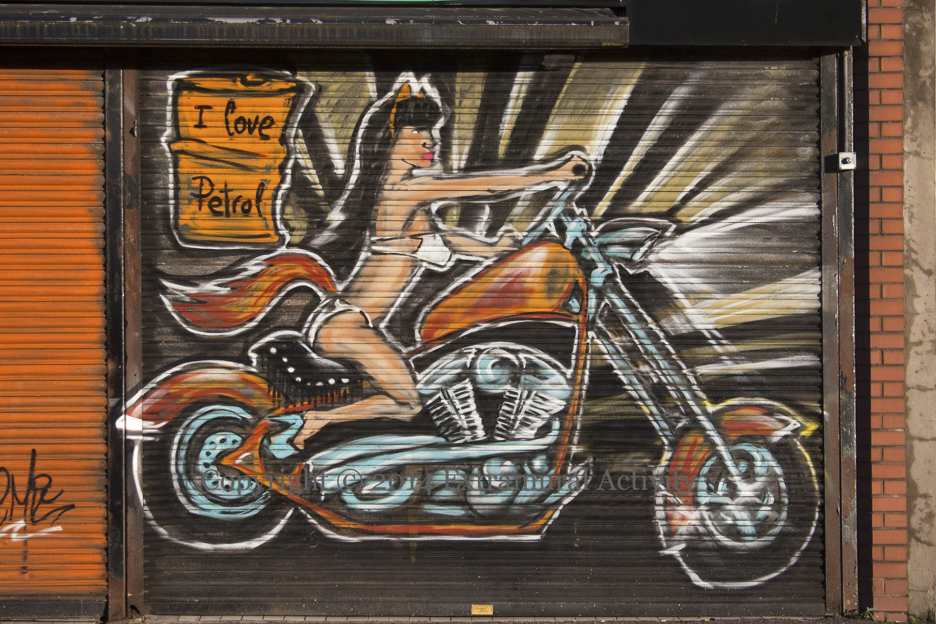 Spanish artist Marta Revillas (Web | Fb) painted the remaining shutter on the Bigg Life Arts centre. Her piece depicts a bikini’ed woman with fox ears and tail astride a motorcycle with an extended fork. Launched 2014-09-26. For the other shutters, see Lost In The Music and Art Lab.