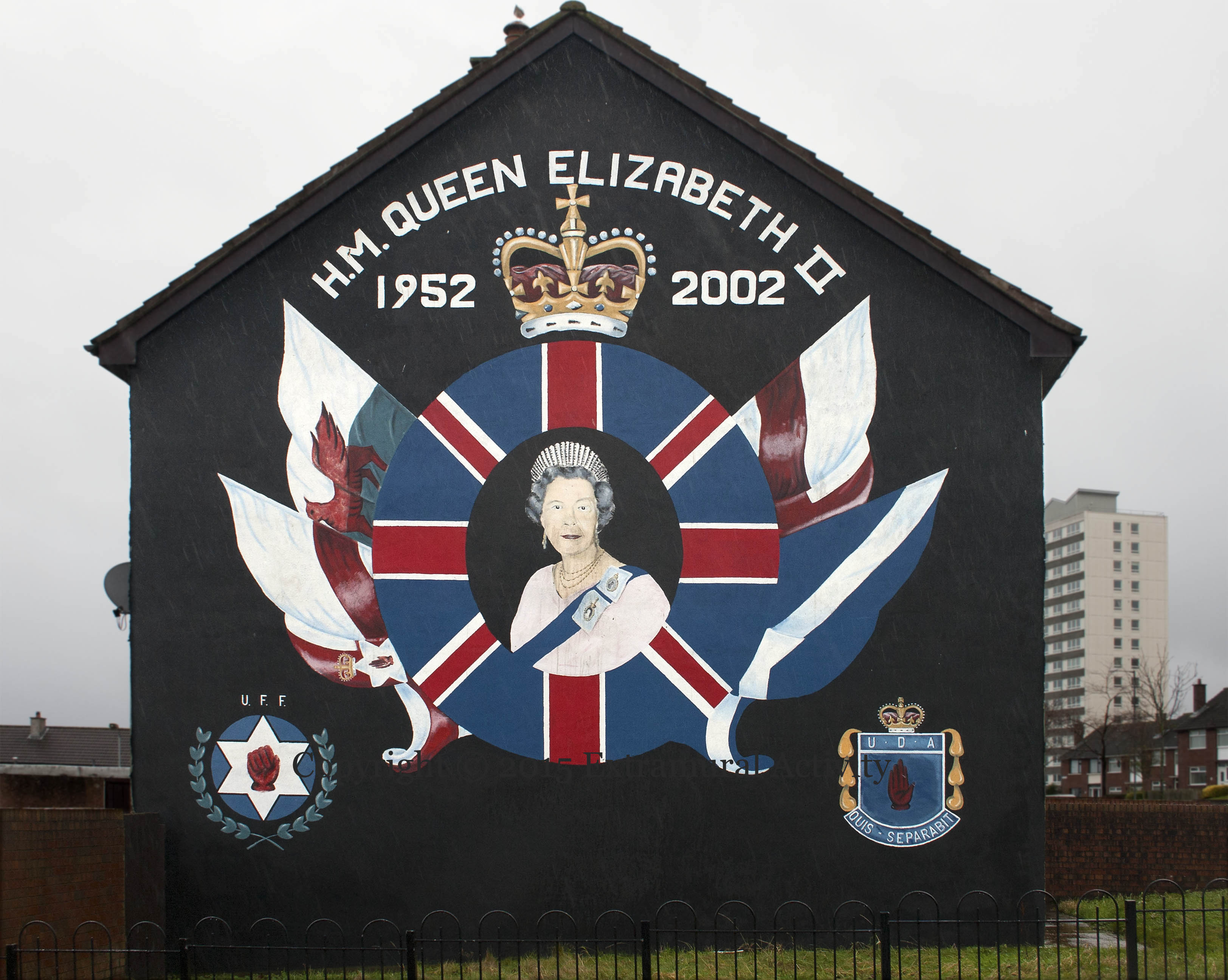 The Queen’s golden jubilee (50th anniversary 1952 – 2002) is celebrated in this long-lasting UFF/UDA mural in Rathcoole. It originally included a (painted) “plaque” at the bottom, which has been painted out. On September 10th, 2015, Elizabeth II will surpass Victoria as the longest reigning British monarch.