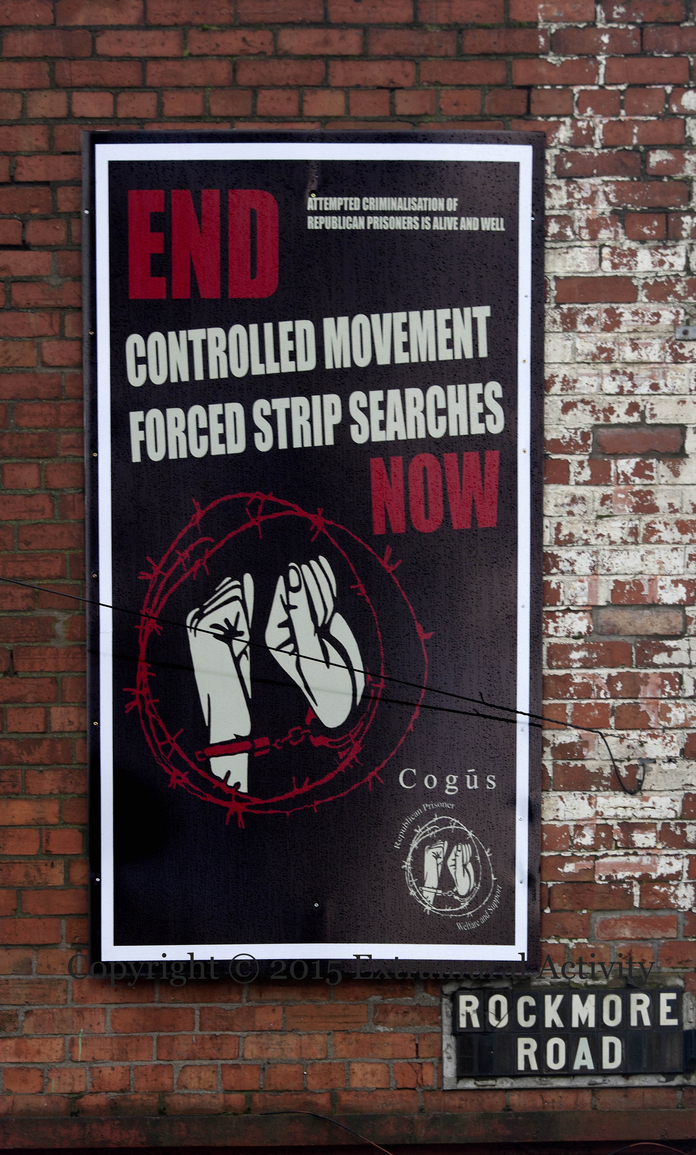 “Attempted criminalisation of republican prisoners is alive and well”: Above is a new board erected 2015-01-23 by Republican Network For Unity (RNU)’s Cogús committee in support of “Republican prisoner welfare and support”: “End controlled movement, forced strip searches now.” On the opposite corner, the Rock Bar advertises the Celtic v Rangers League Cup match last Sunday February 1st.