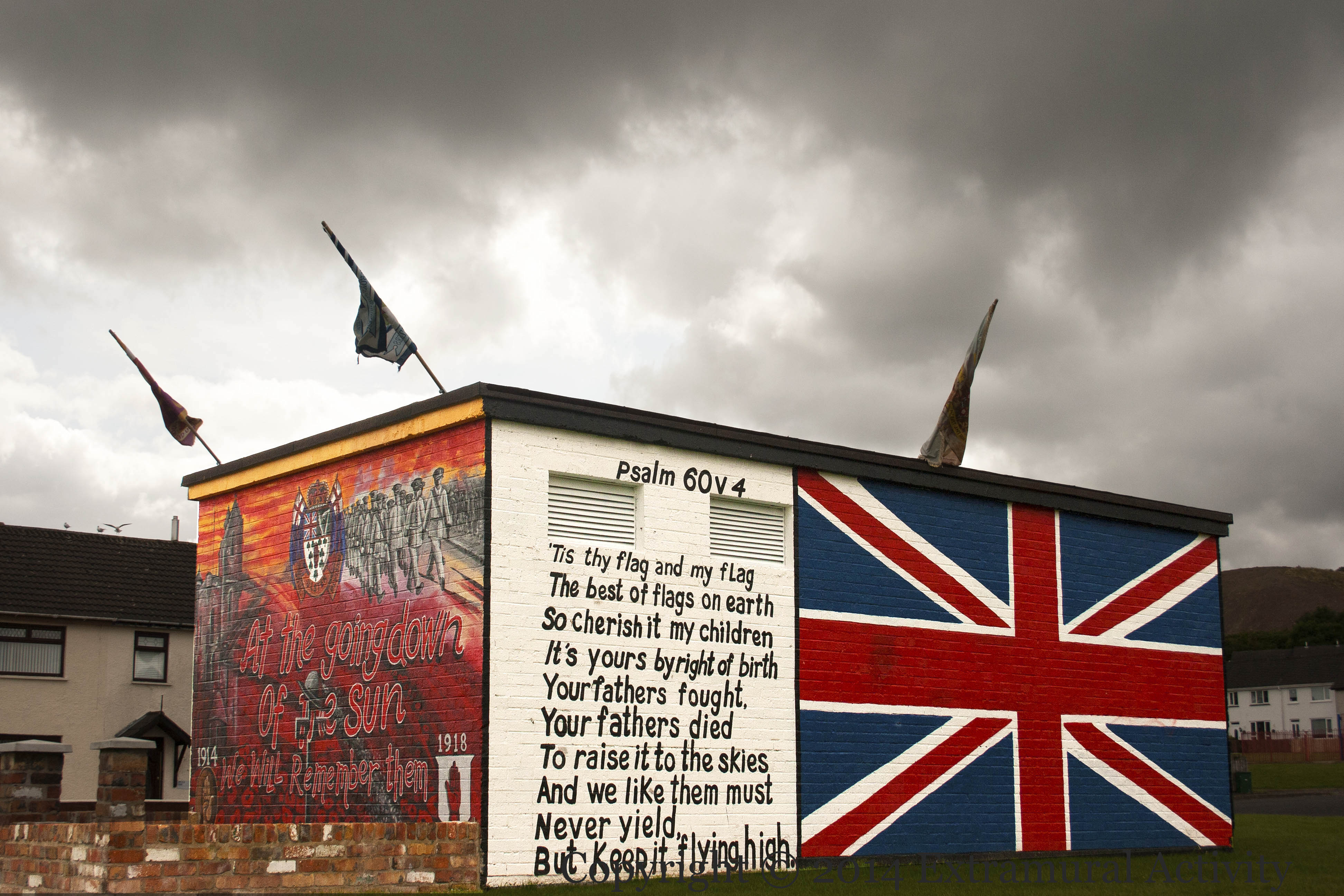 Translations of Psalm 60.4 vary, but it is something like “You (the Lord) have given those who fear you a banner so that they will not flee before your arrows”, which might work quite well alongside a Union jack. But in fact, only one source claims the poetic lines on the side of this Ballyduff electrical sub-station come from Psalm 60.4; they are rather the first stanza of a 1902 poem (earliest found mention), The Union Jack, by Edward Shirley, in Little Poems For Little People: