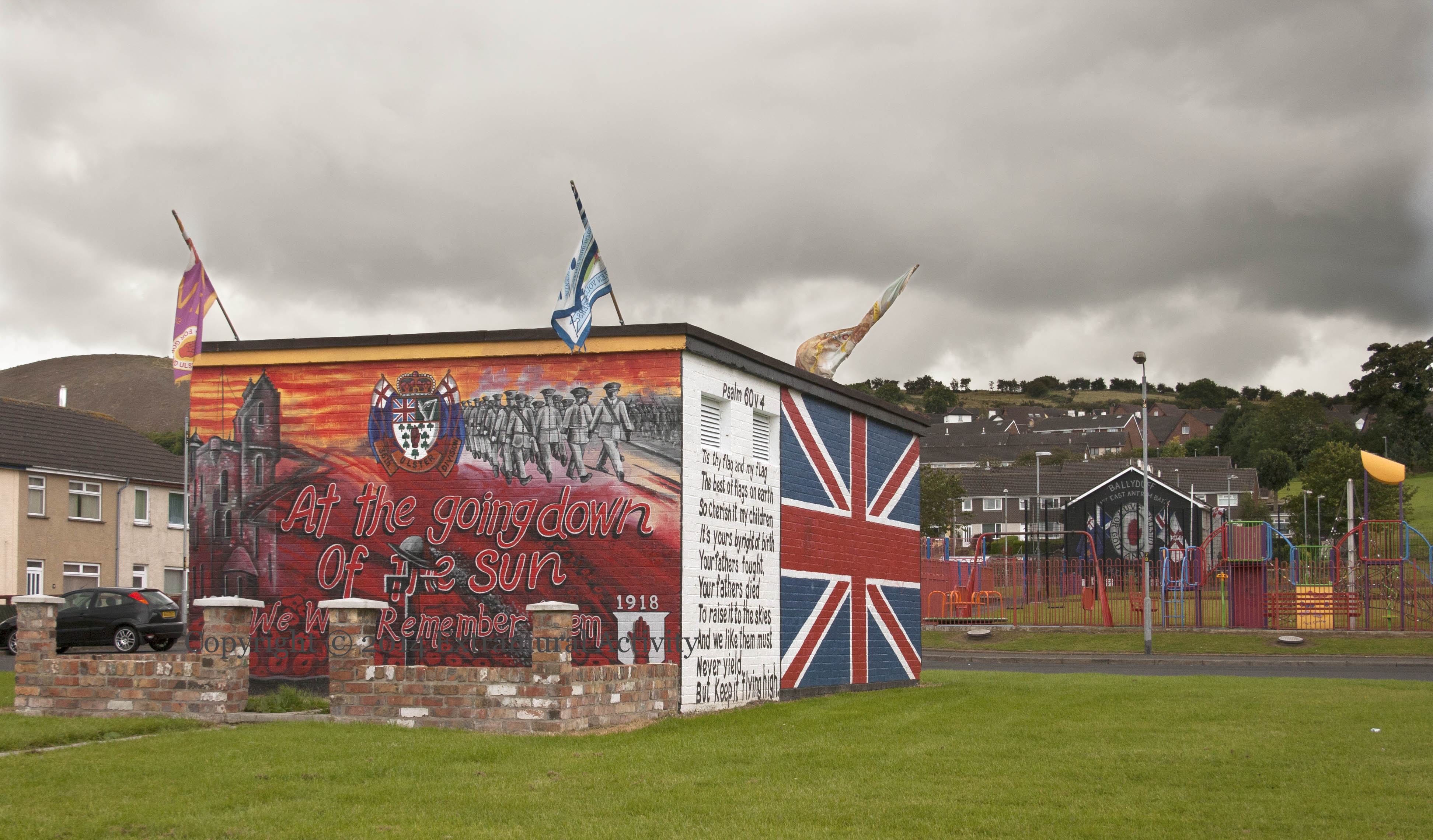 For the other three sides of the structure see Absent Friends | The Ultimate Sacrifice. For the mural in the distance (of the wide shot, below), see 1st East Antrim Ballyduff