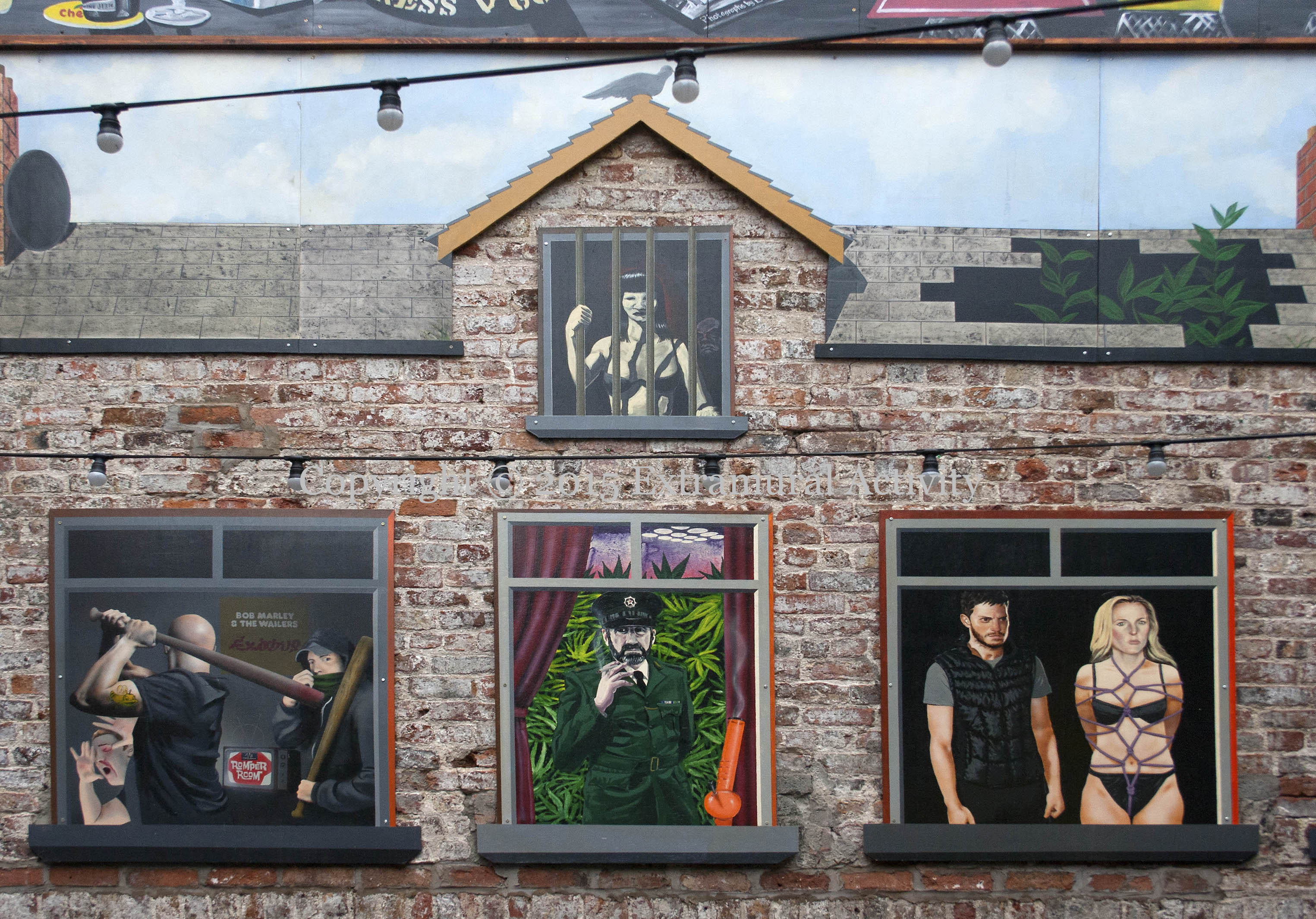 The panel above is one of a dozen from the new “upstairs” part of the Belfast Windows piece by Ciaran Gallagher (web) in the courtyard of the Dark Horse/Duke Of York. As Ciaran himself warns on his Facebook page, the “upstairs” material is adult and “not for the faint-hearted”. Below you can see the middle quartet: in the attic, a semi-nude woman behind bars with a menacing face in the background; on the left, Romper Room is on the TV and the skinhead sports a Mr. Do-Bee tattoo, but this is a UDA romper room, not kid’s playtime: two hoods take baseball bats to a victim; and in the middle, a pot-smoking policeman (in RUC/early-PSNI uniform) stands under the grow-lights of a cannabis factory.